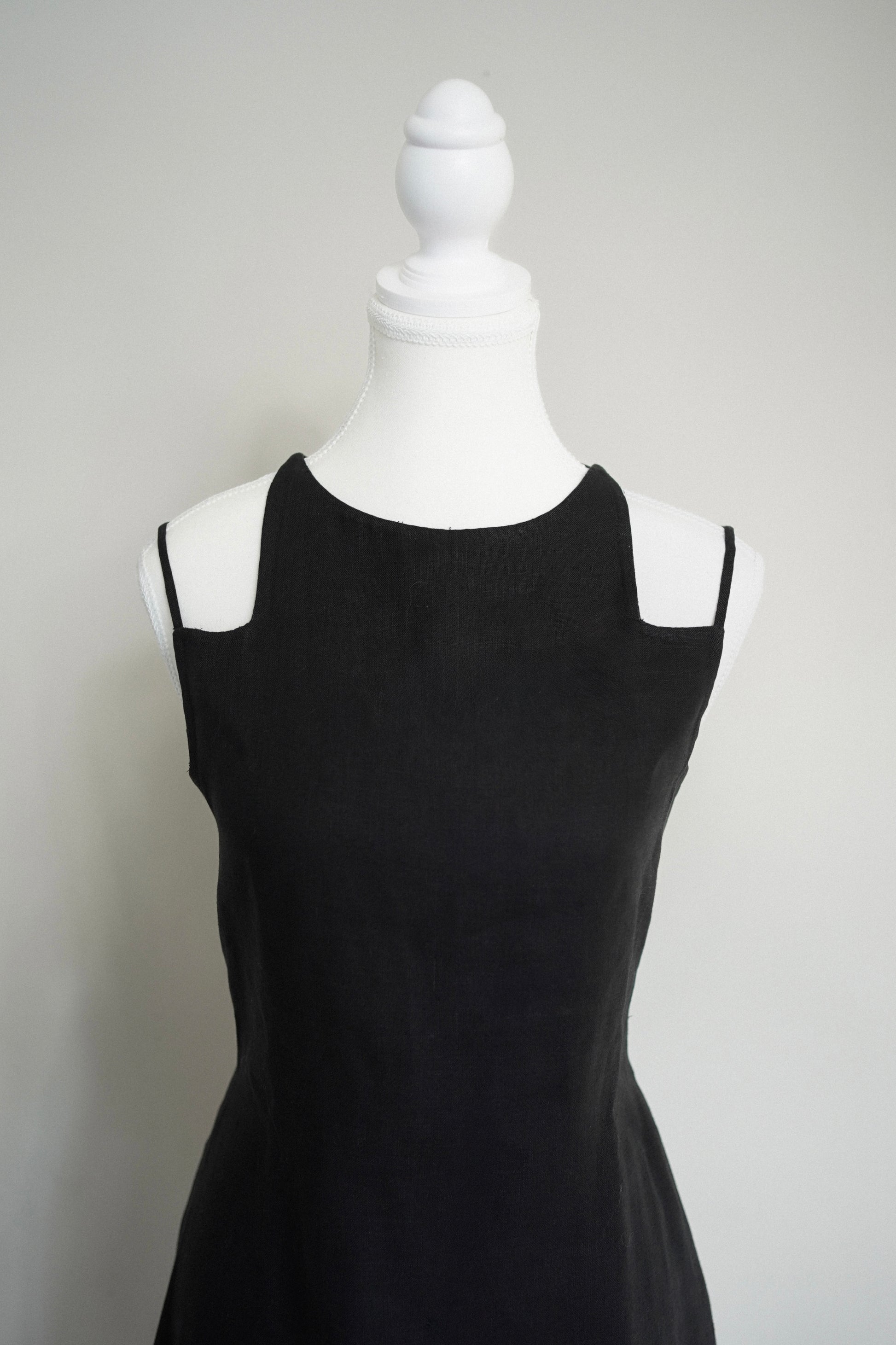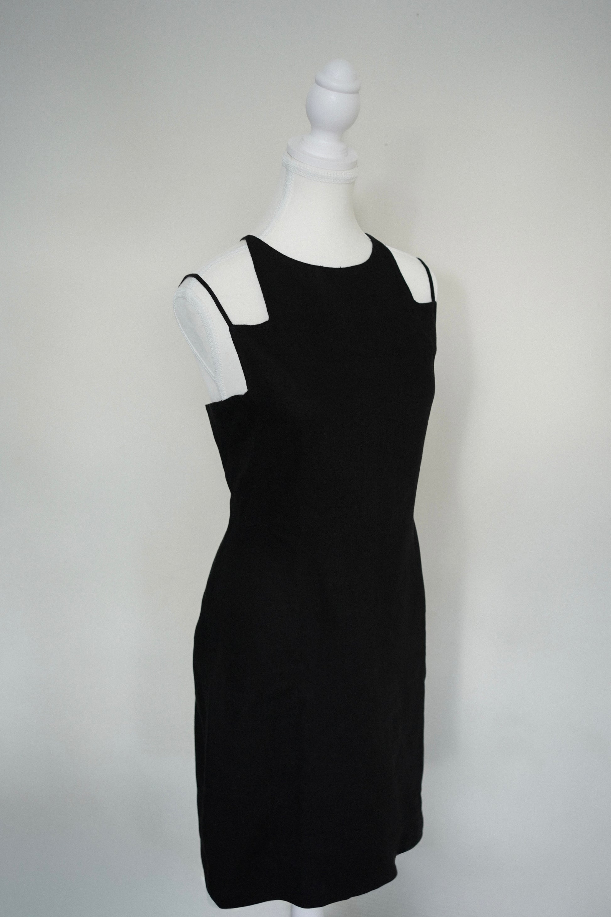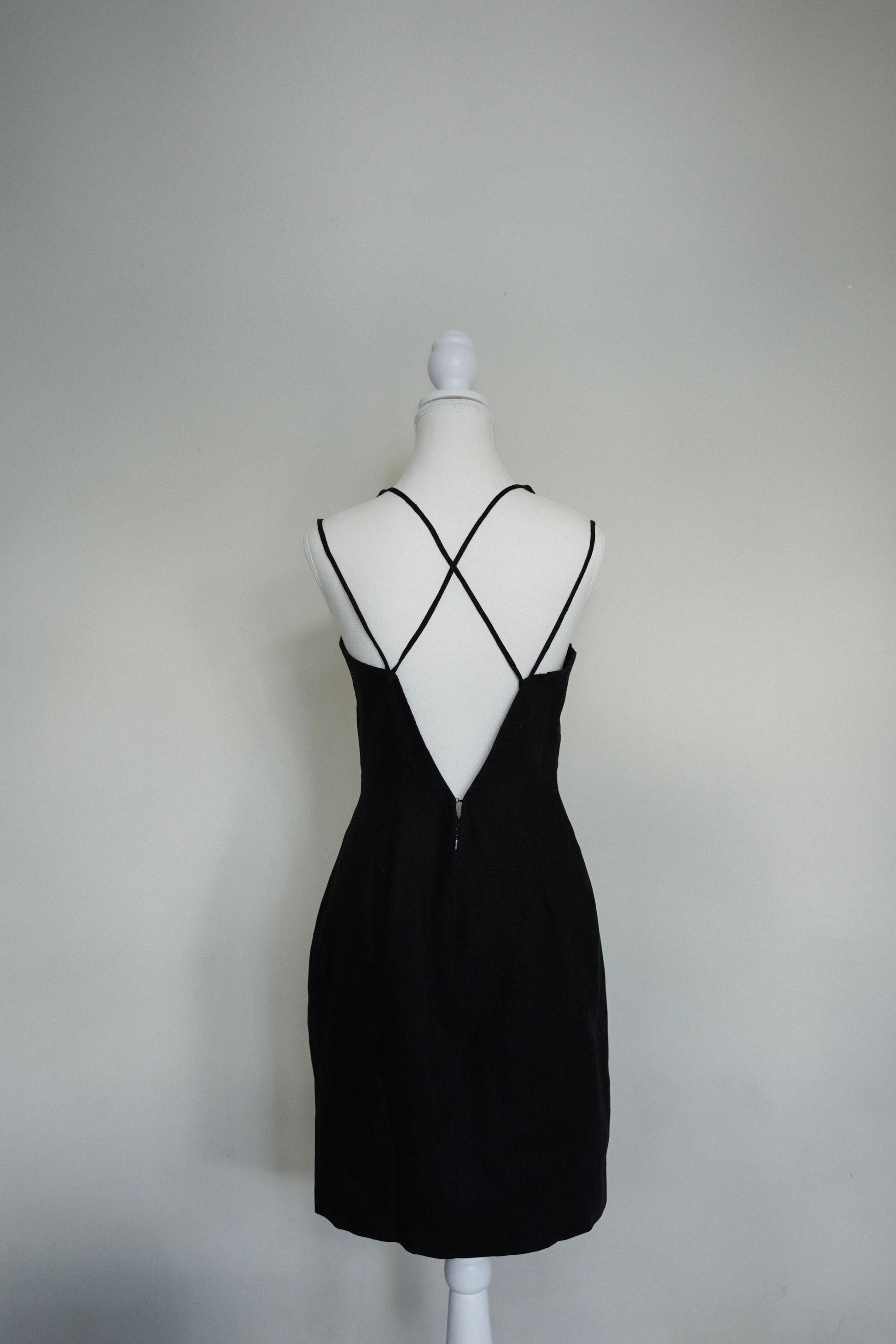 DESCRIPTION: Vintage 1970s Bill Blass black minimalist sheath dress featuring a striking criss-cross open back and refined silhouette. A chic example of Blass’s signature understated American luxury — perfect for cocktail, evening, or day to day.