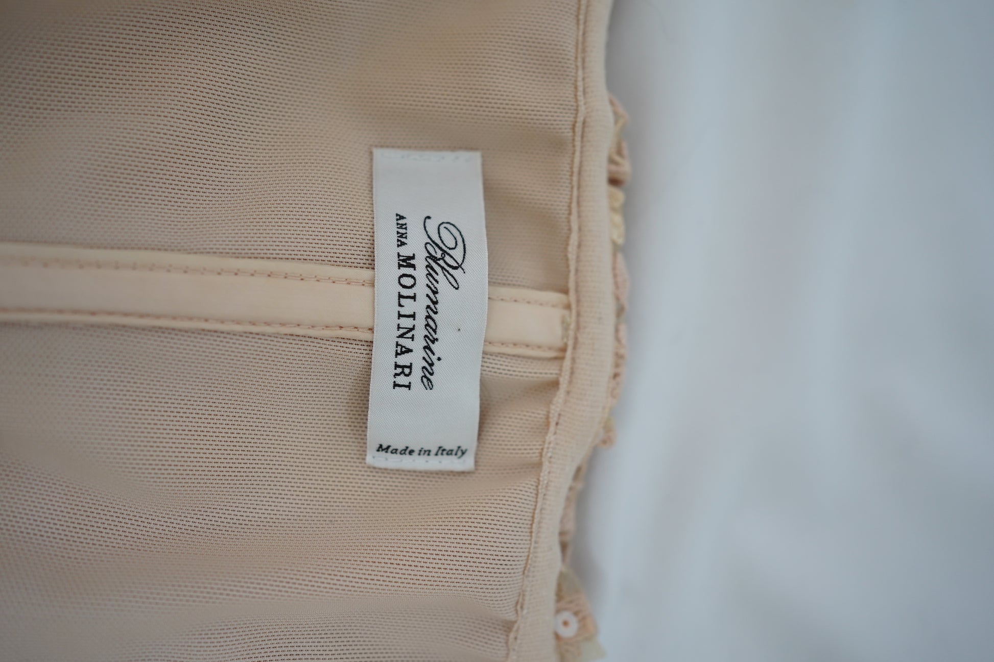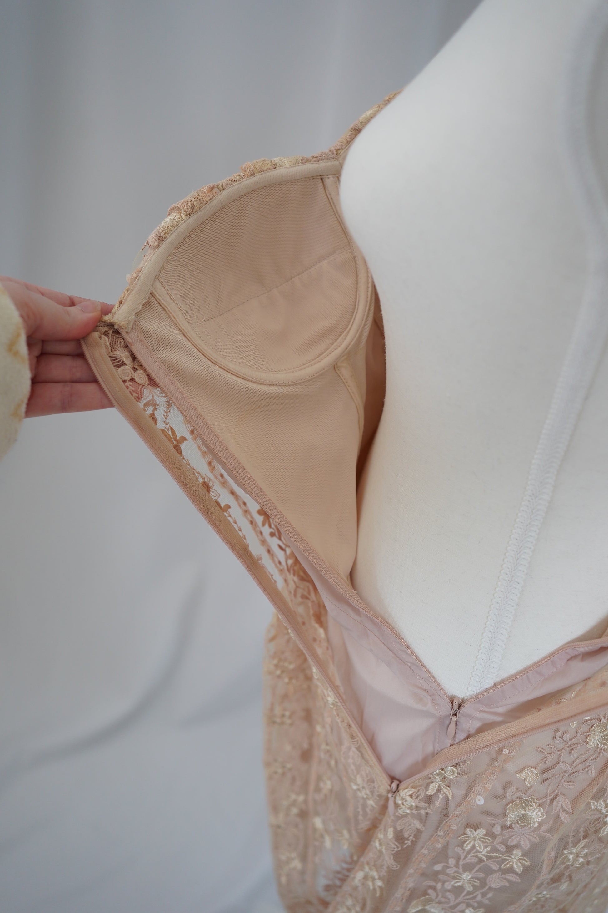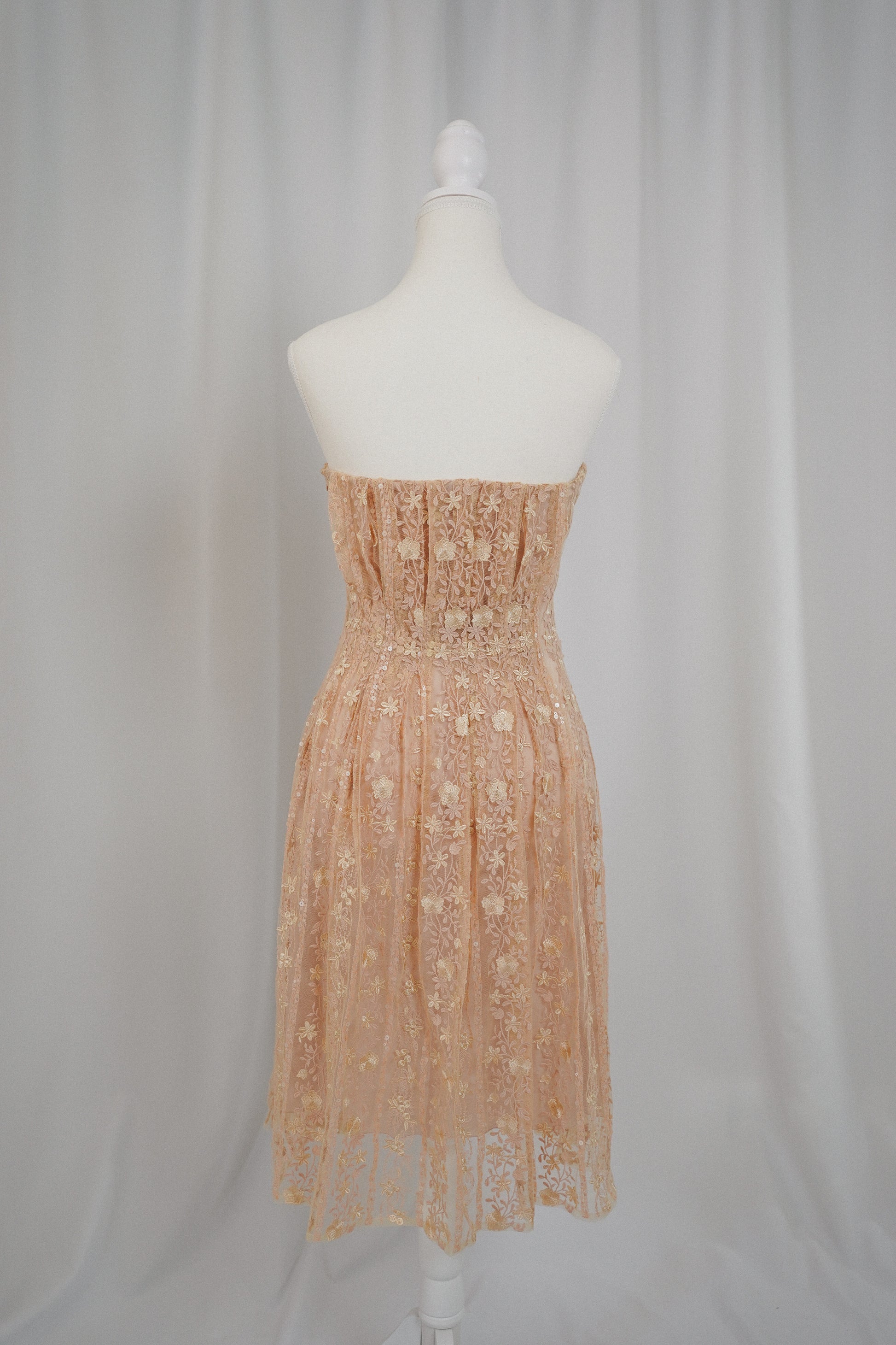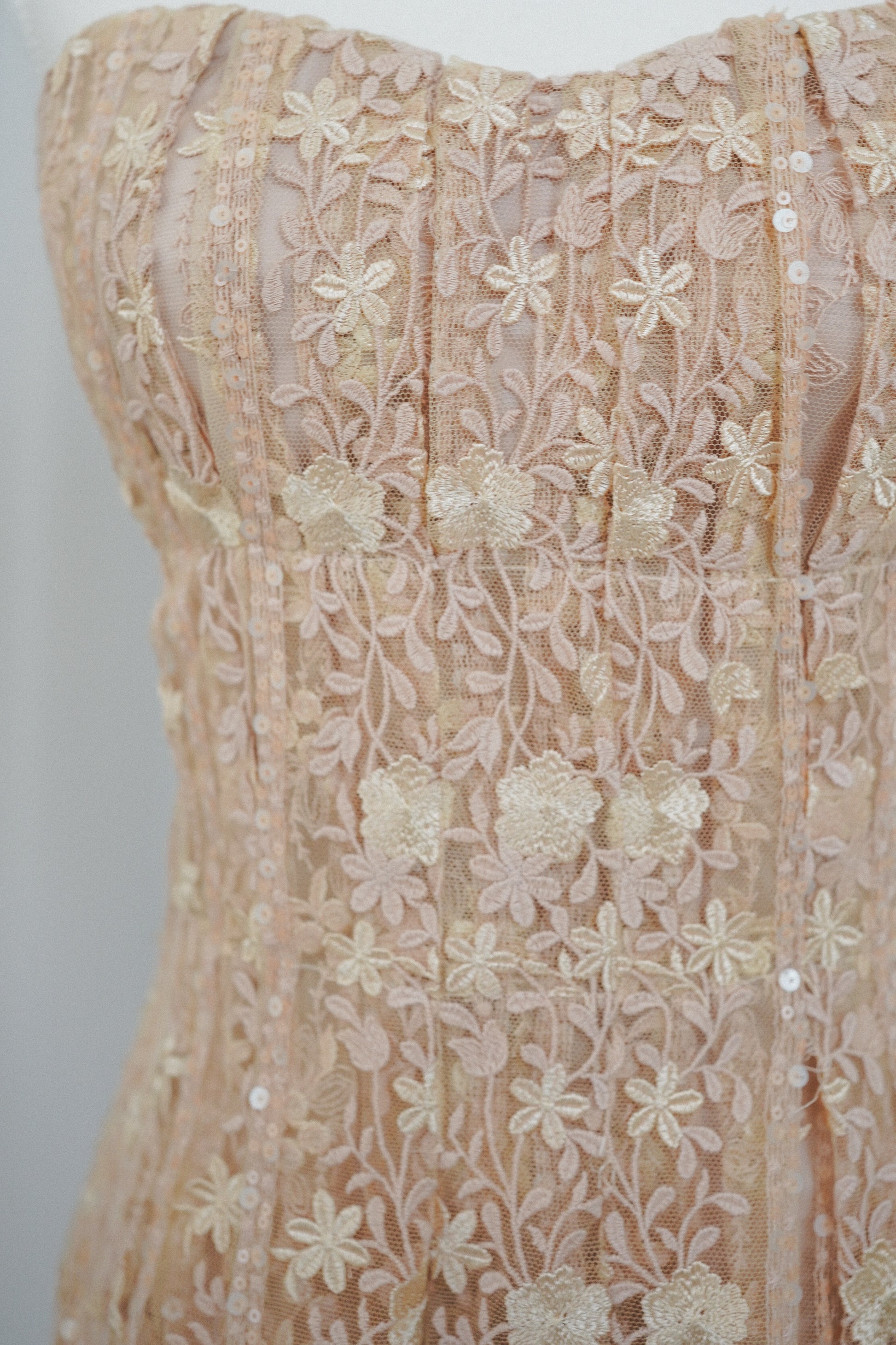 Romantic Blumarine by Anna Molinari strapless dress crafted in Italy from delicate embroidered tulle in a soft blush-champagne tone. The bodice is beautifully structured with corsetry, featuring built-in underwire cups and vertical boning for support and shape, while the semi-sheer floral lace overlay is accented with subtle sequins throughout. Fully lined with a silk-blend lining and finished with a side zip. An ultra-feminine, lingerie-inspired piece that moves effortlessly between bridal events, European summer evenings, and romantic occasion wear.