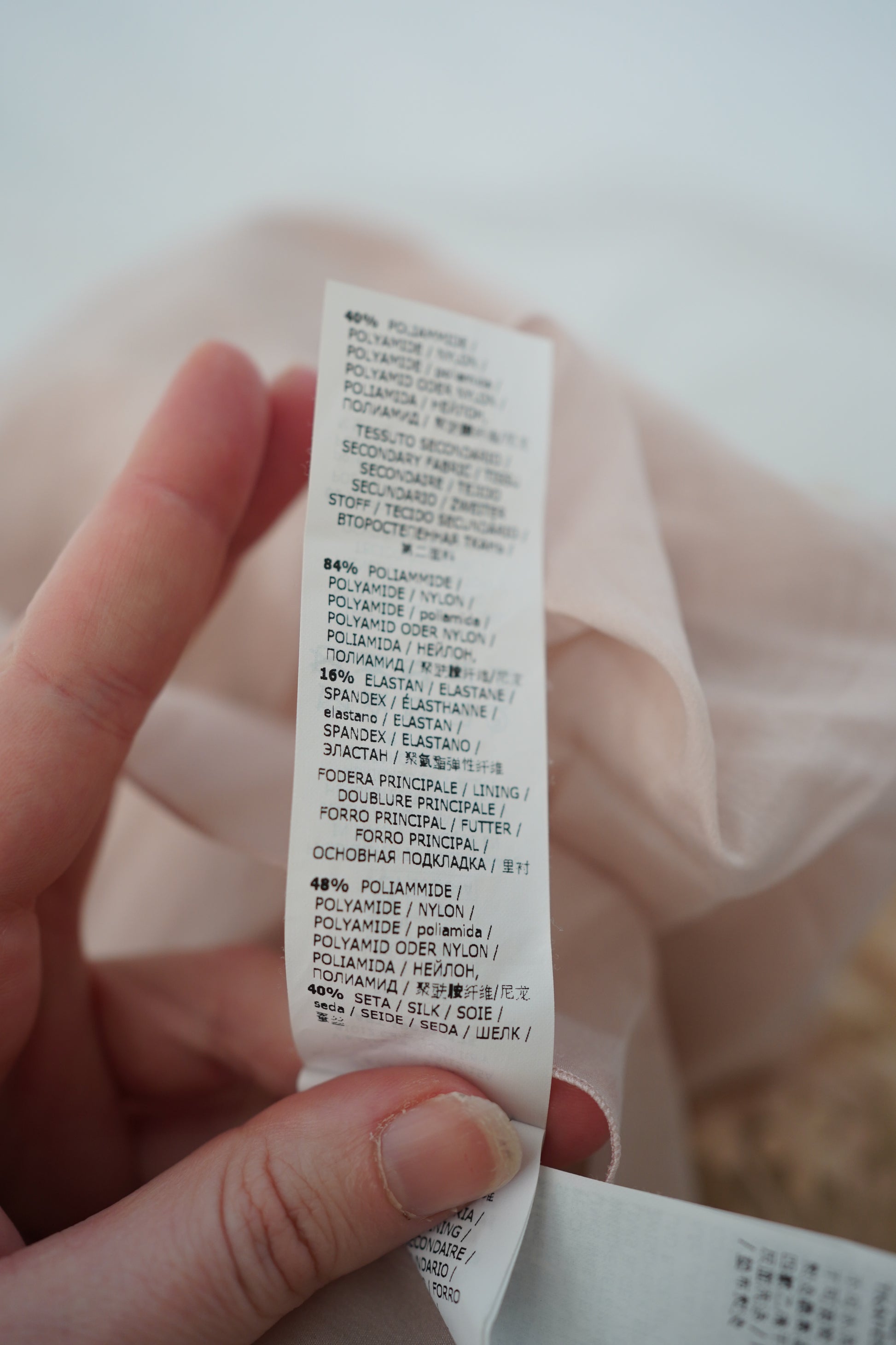 Polyester & Polyamide (nylon) with silk-blend lining and elastane (see tag for full details)