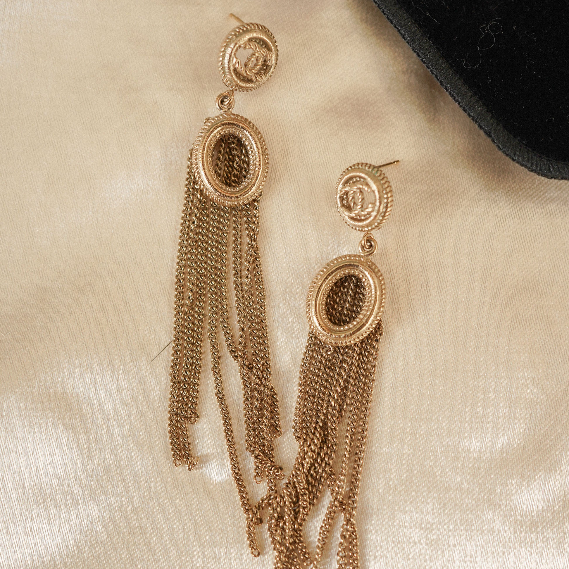 Striking Chanel gold-tone tassel earrings from the B16 Pre-Fall 2016 collection. These dramatic statement earrings feature a rope-textured round medallion with an openwork interlocking CC, suspending an oval rope-edged frame cascading into multi-strand chain tassels.