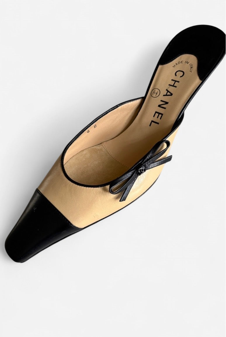 Chanel two-tone kitten heels in beige and black leather, crafted with a structured square pointed toe and finished with a petite bow and subtle CC charm. An iconic neutral Chanel two-tone style.
