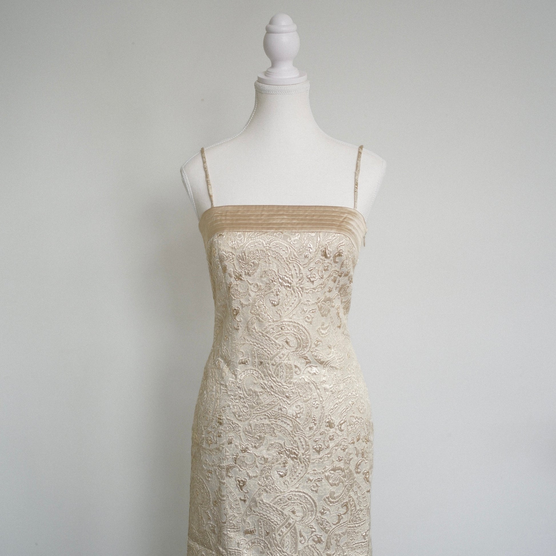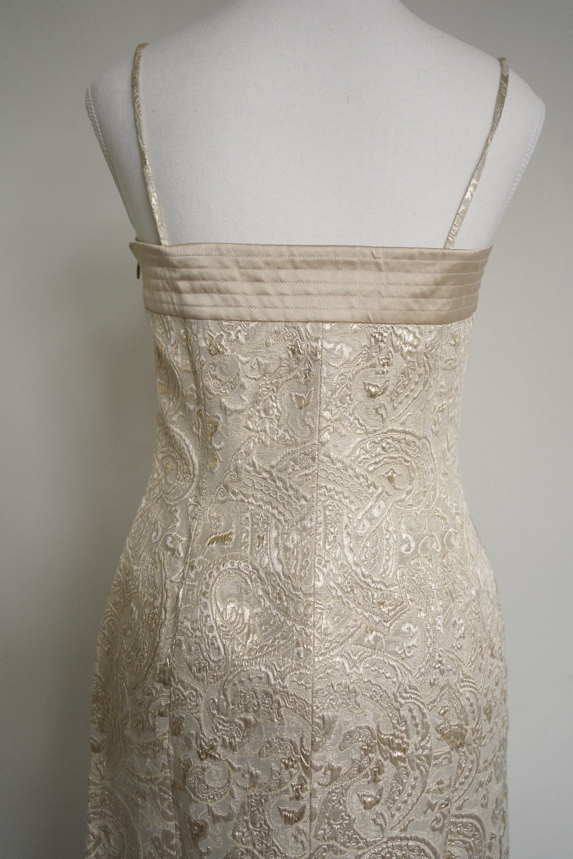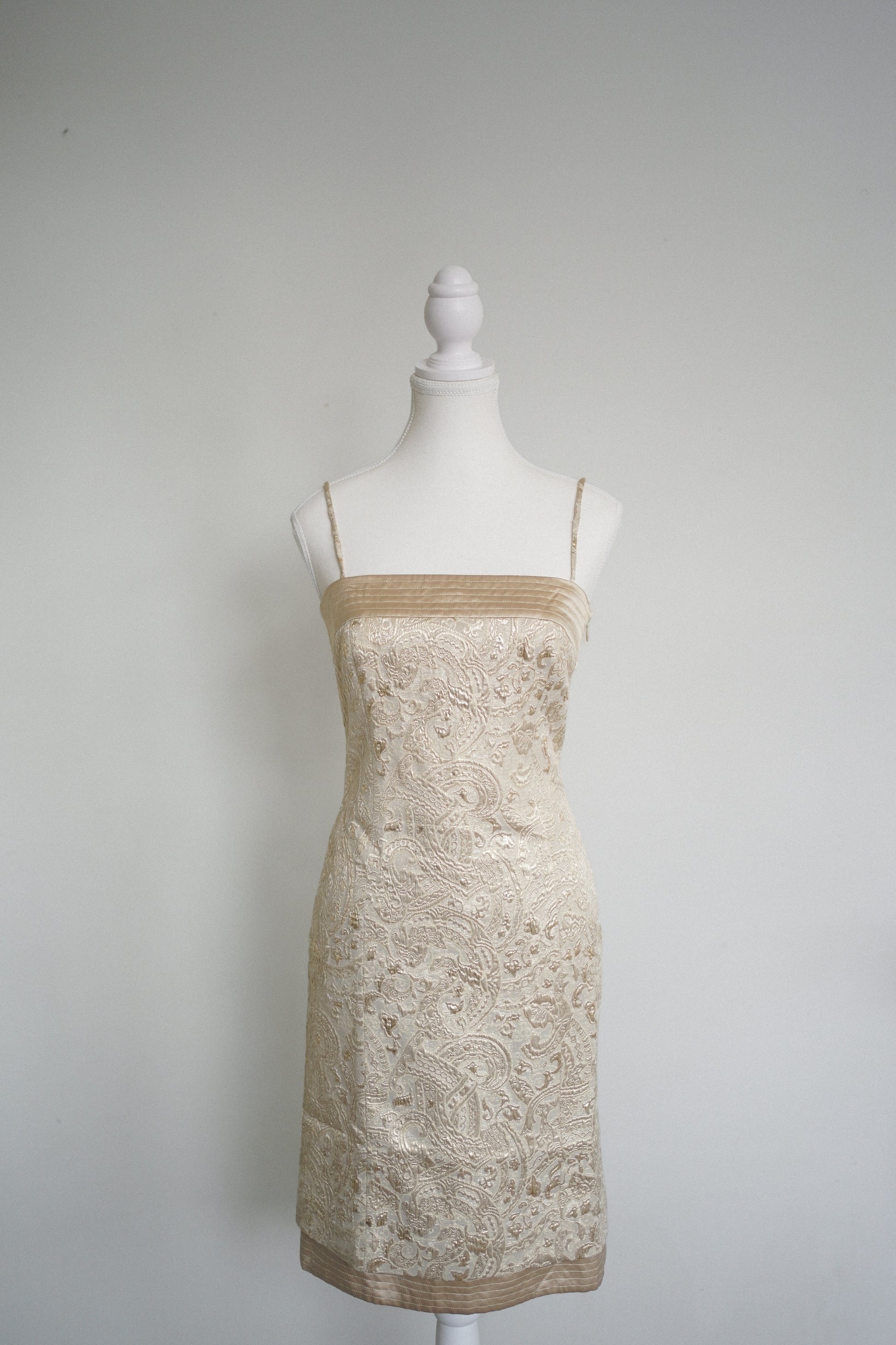 A stunning Escada Couture gold brocade cocktail dress with delicate metallic embroidery and a structured, body-skimming silhouette. Features a quilted silk banded neckline and slim straps.
