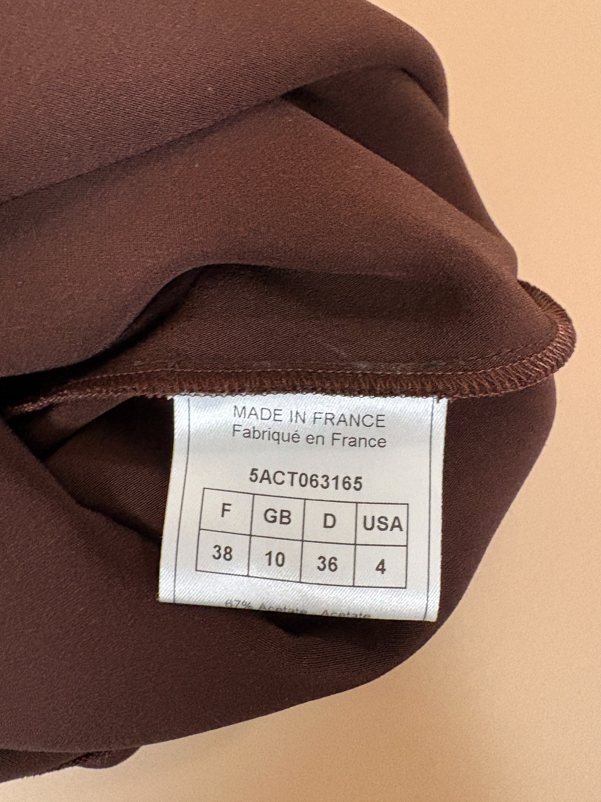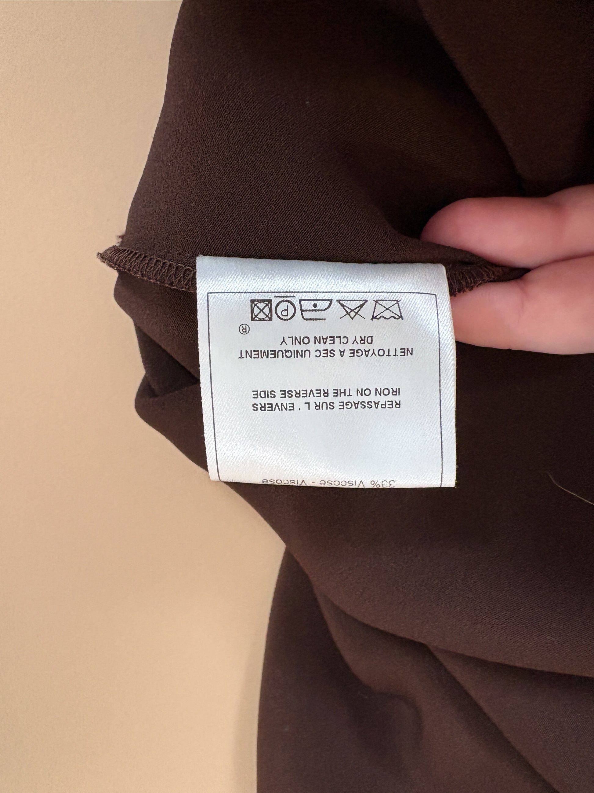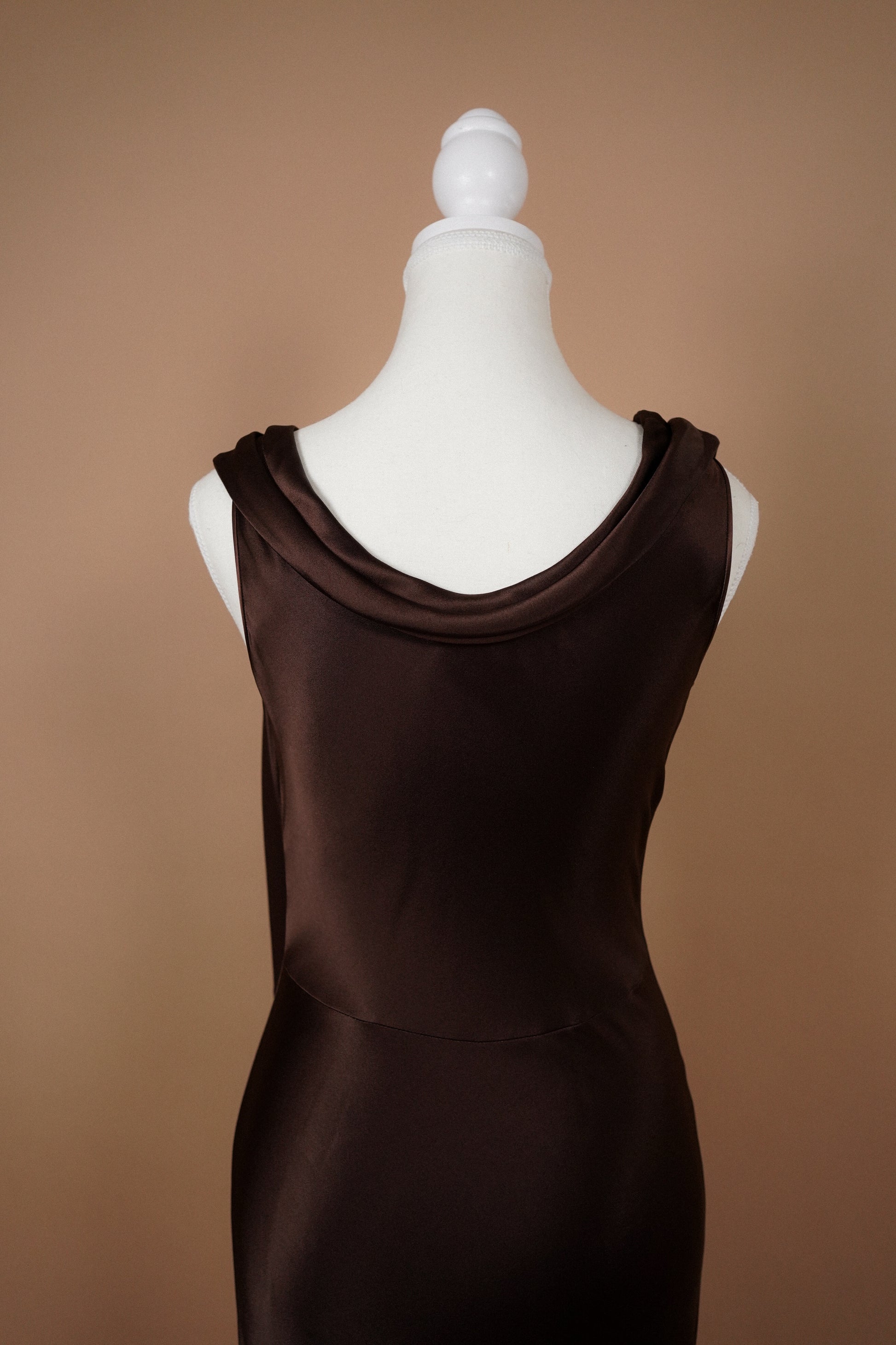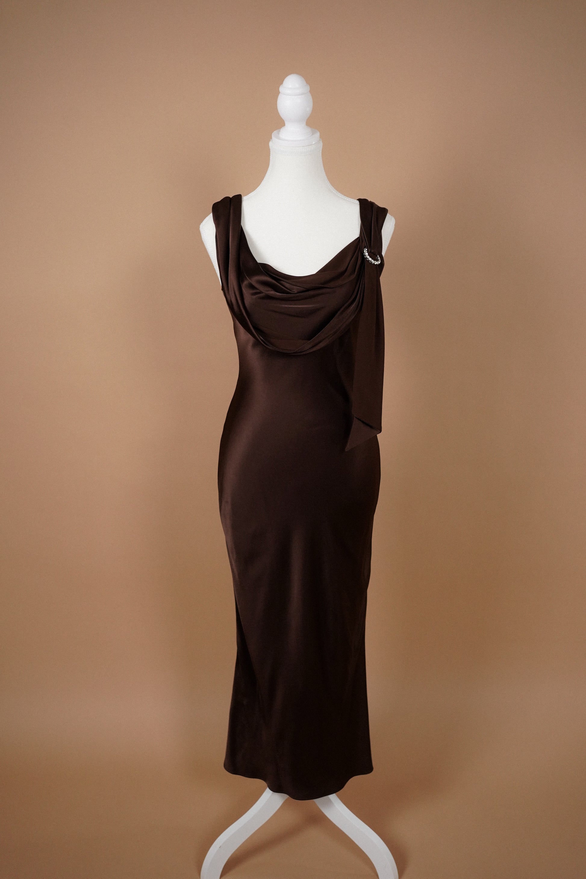 A sleek John Galliano chocolate brown satin dress with soft draped neckline and asymmetric shoulder detail, finished with a delicate crystal accent. Elegant, minimalist and very early-2000s Galliano — perfect as a refined evening piece or elevated bridal-adjacent look.