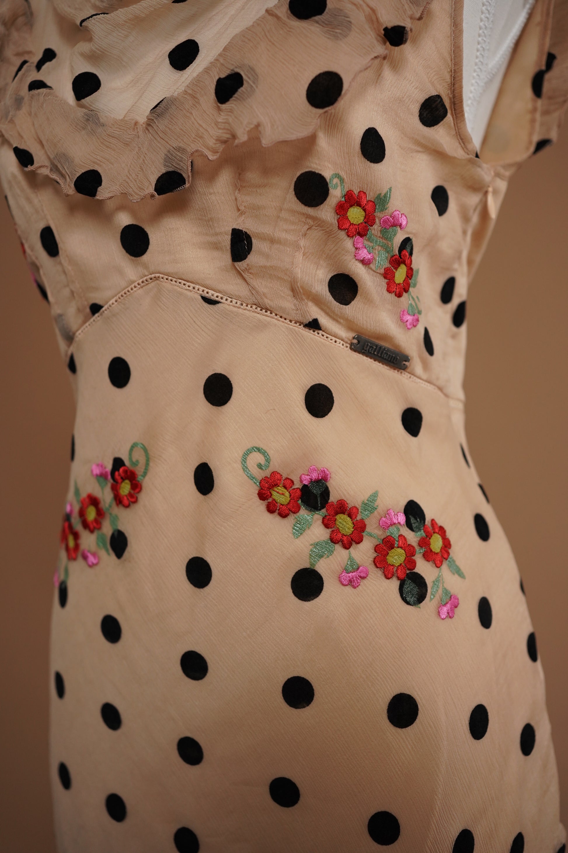 A romantic archival Galliano silk dress, documented as worn in a 2008 Galliano advertising campaign. Rendered in a soft nude silk with classic black polka dots, this piece features the house’s signature draped neckline, fluttering ruffle details, and delicate floral embroidery at the bodice.
