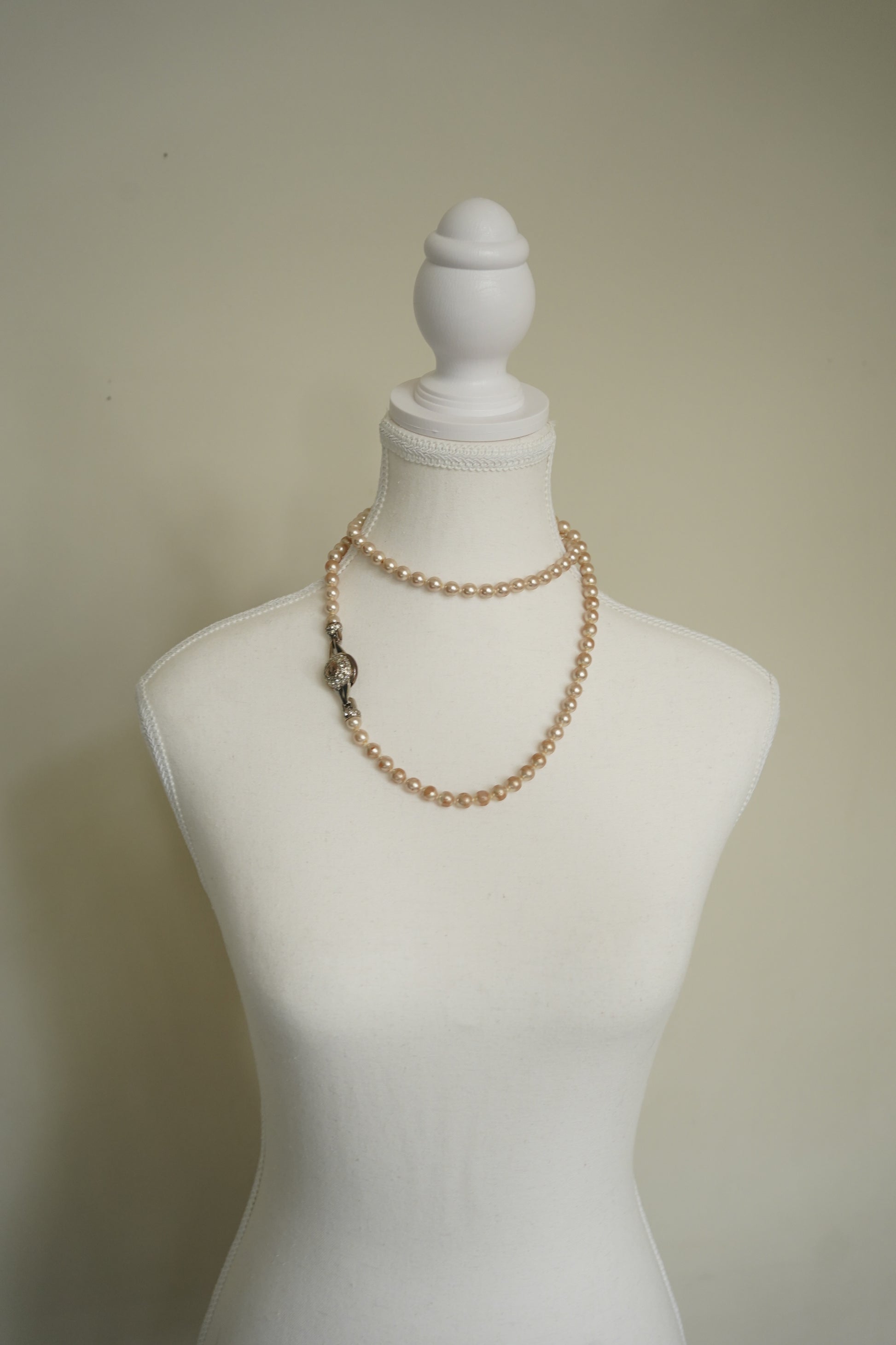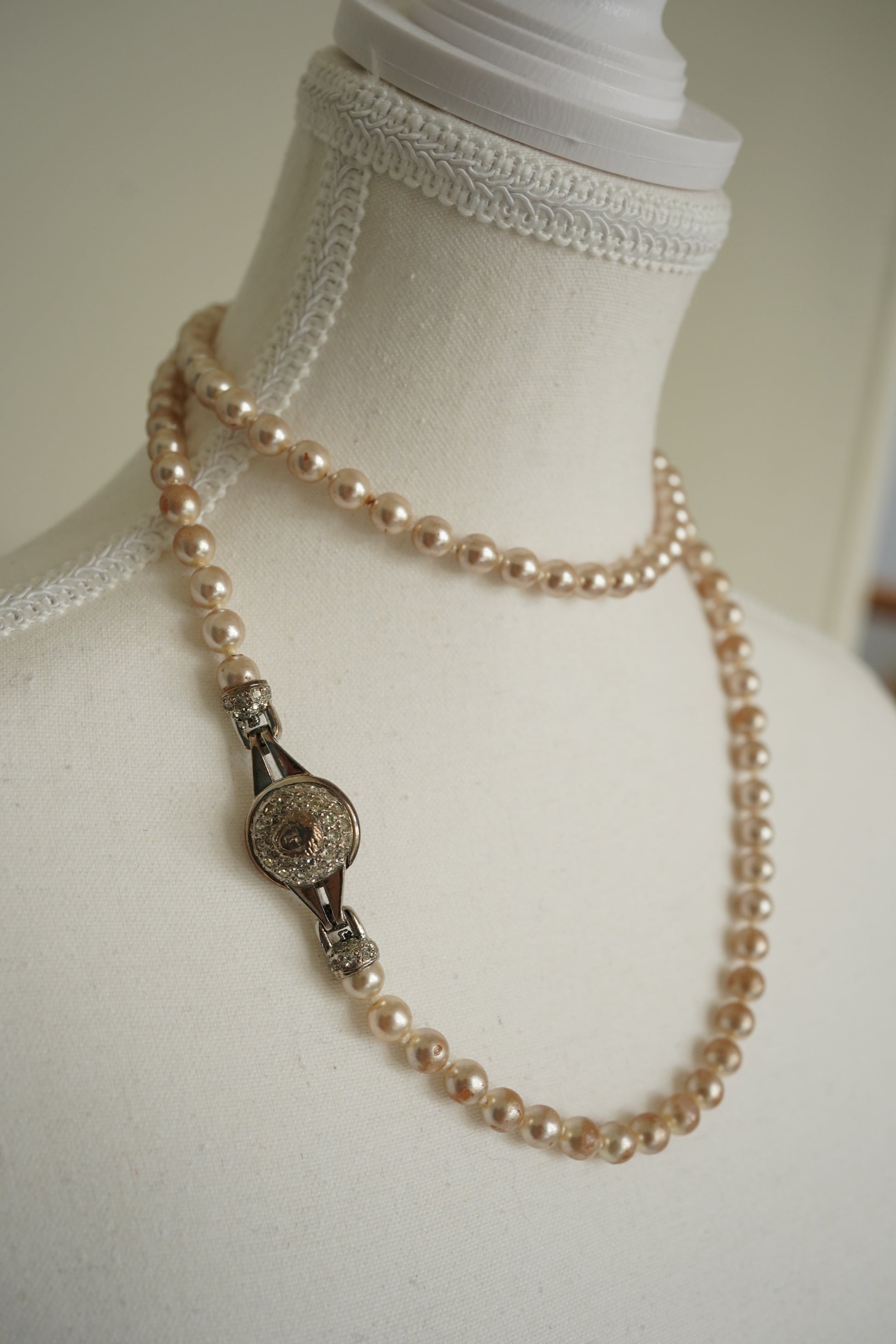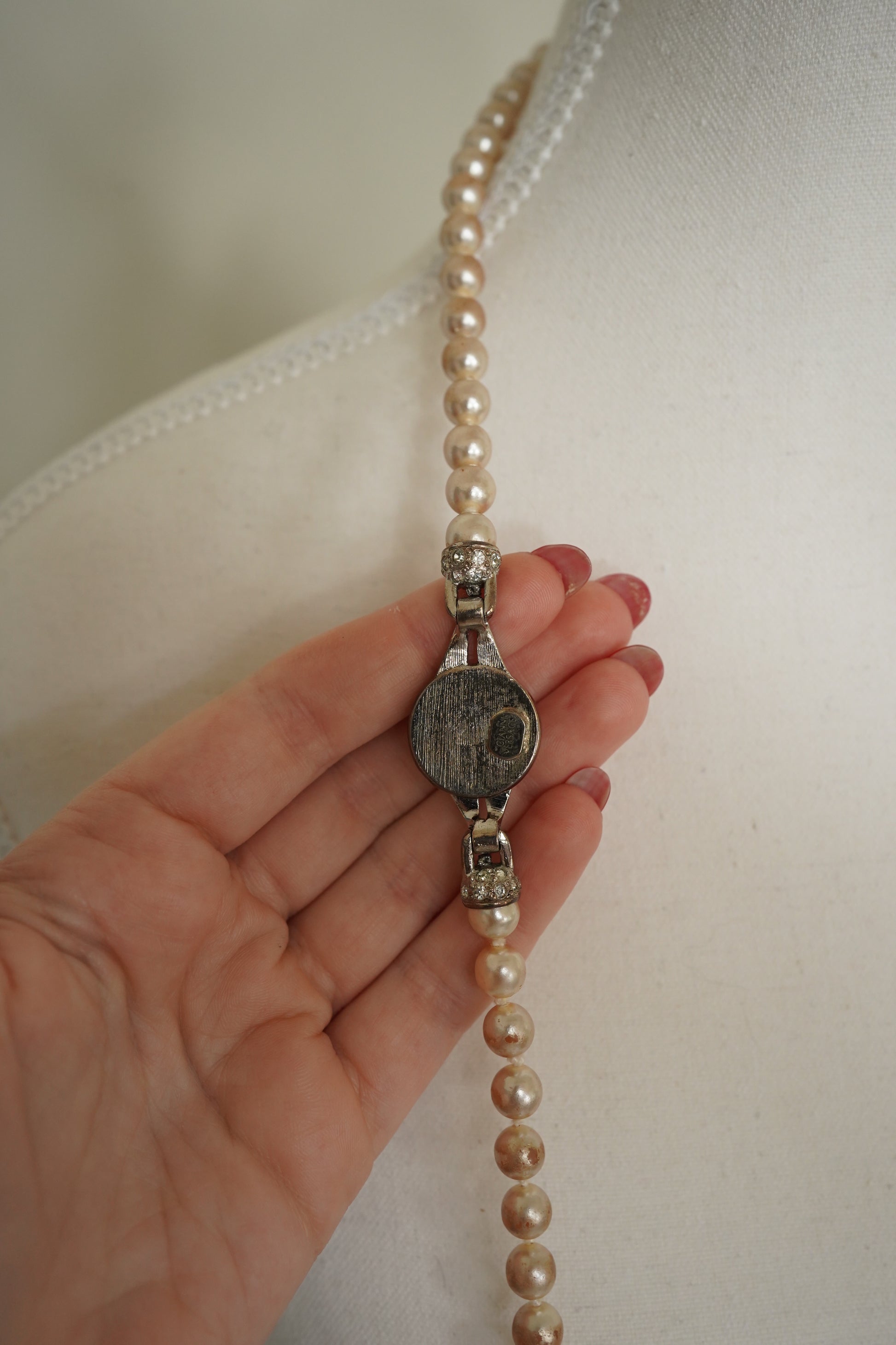 DESCRIPTION: Vintage Gianni Versace champagne-tone faux pearl necklace featuring the brand’s signature pavé-crystal Medusa clasp in silver-tone metal.