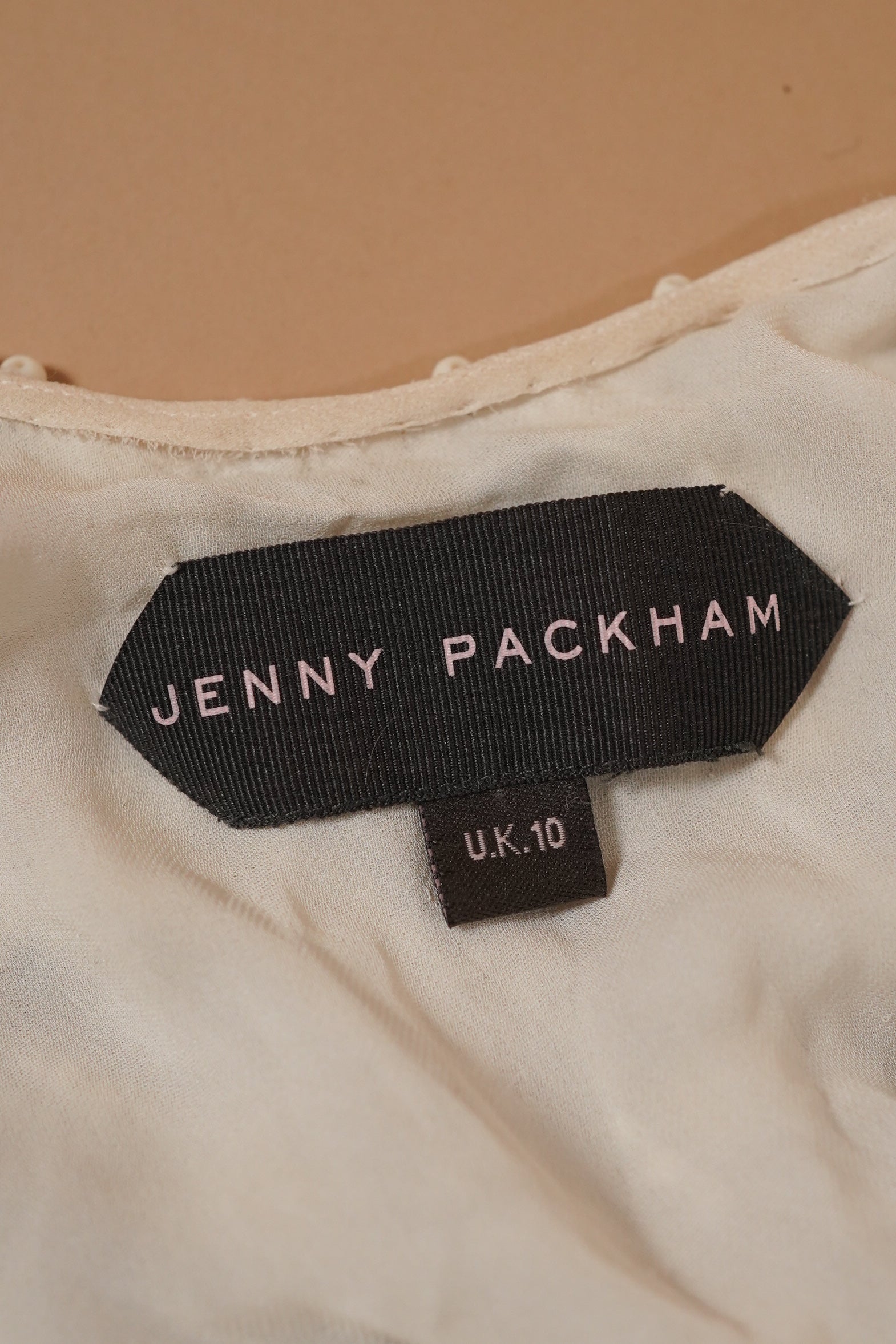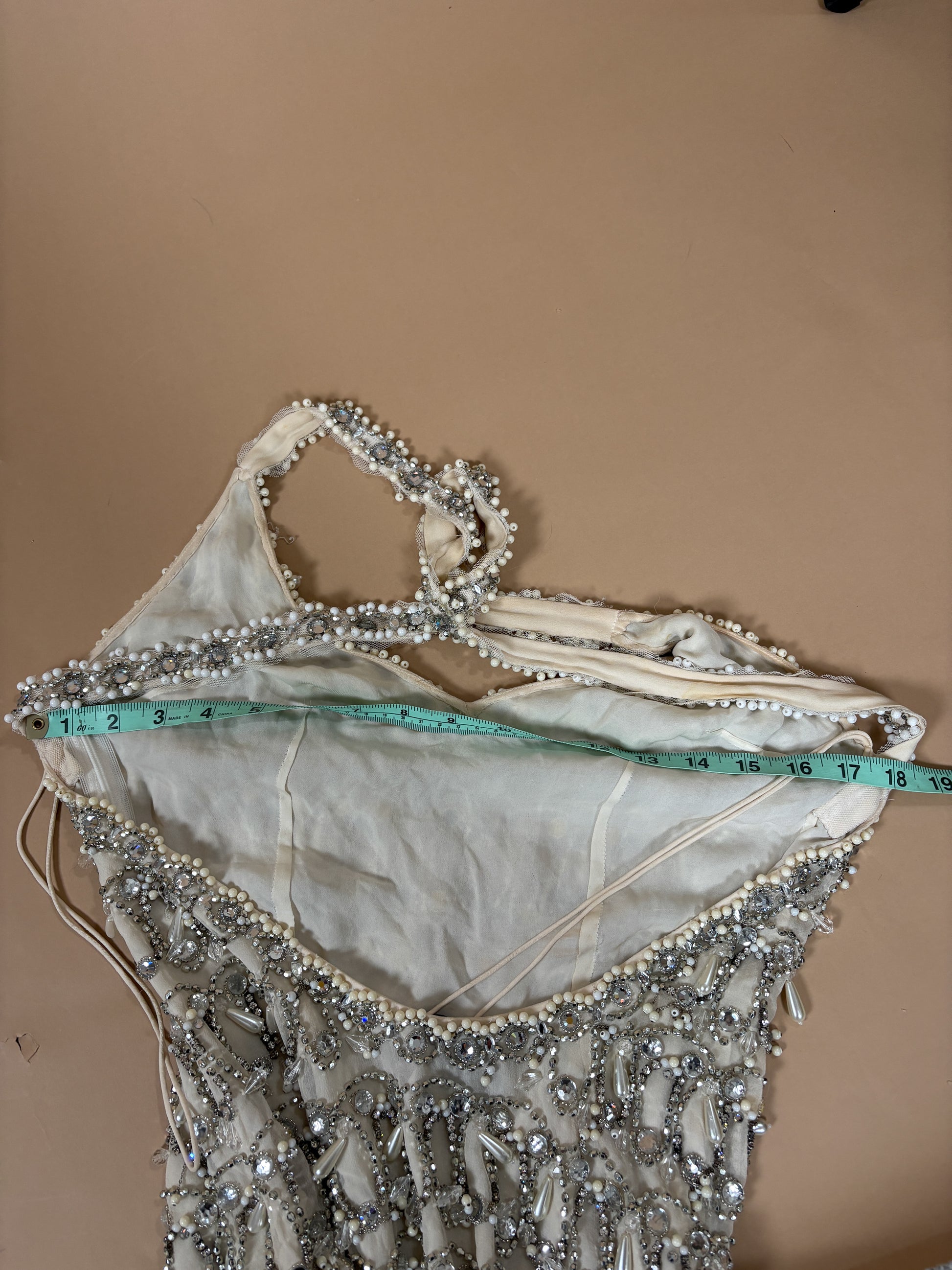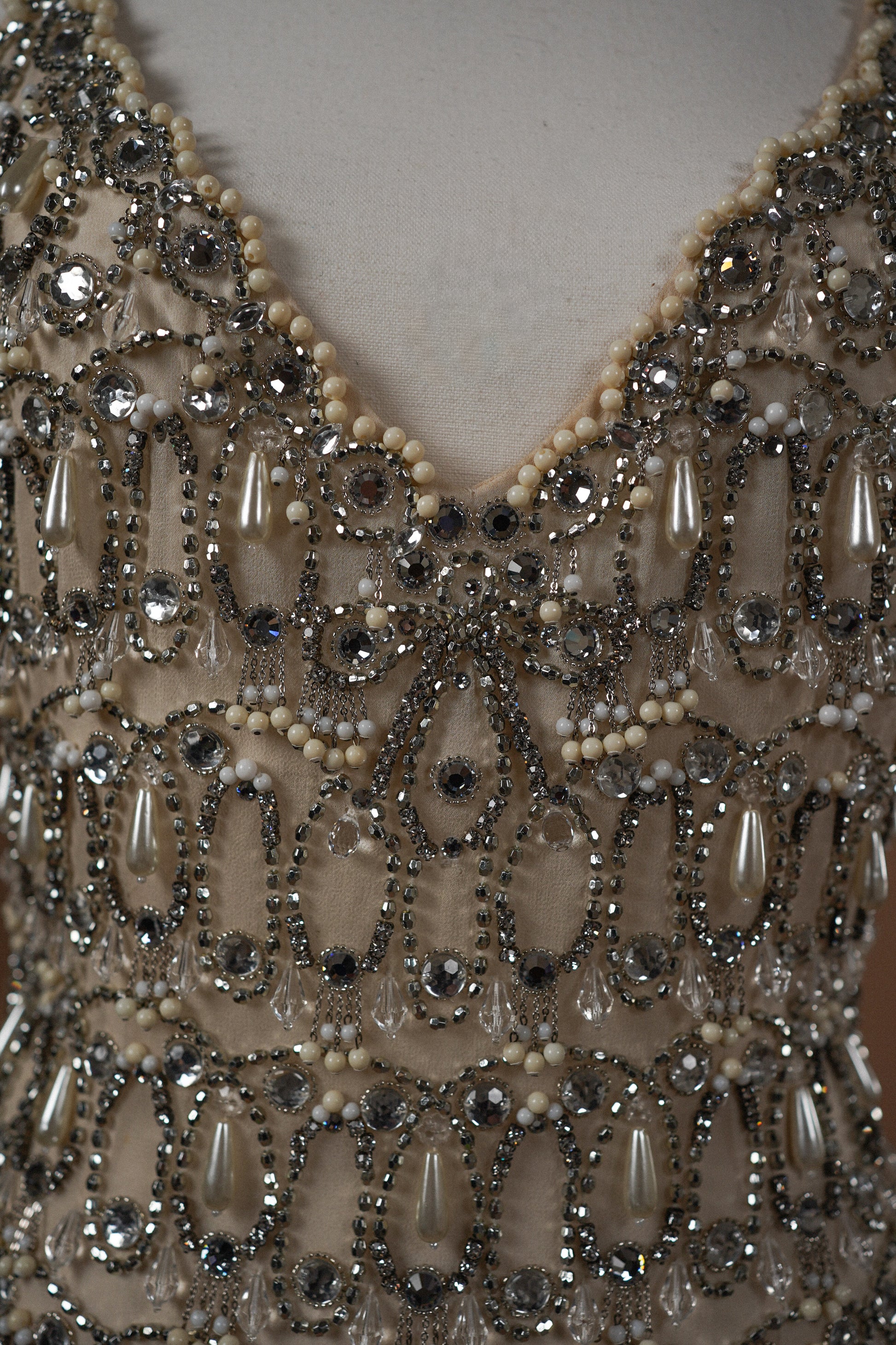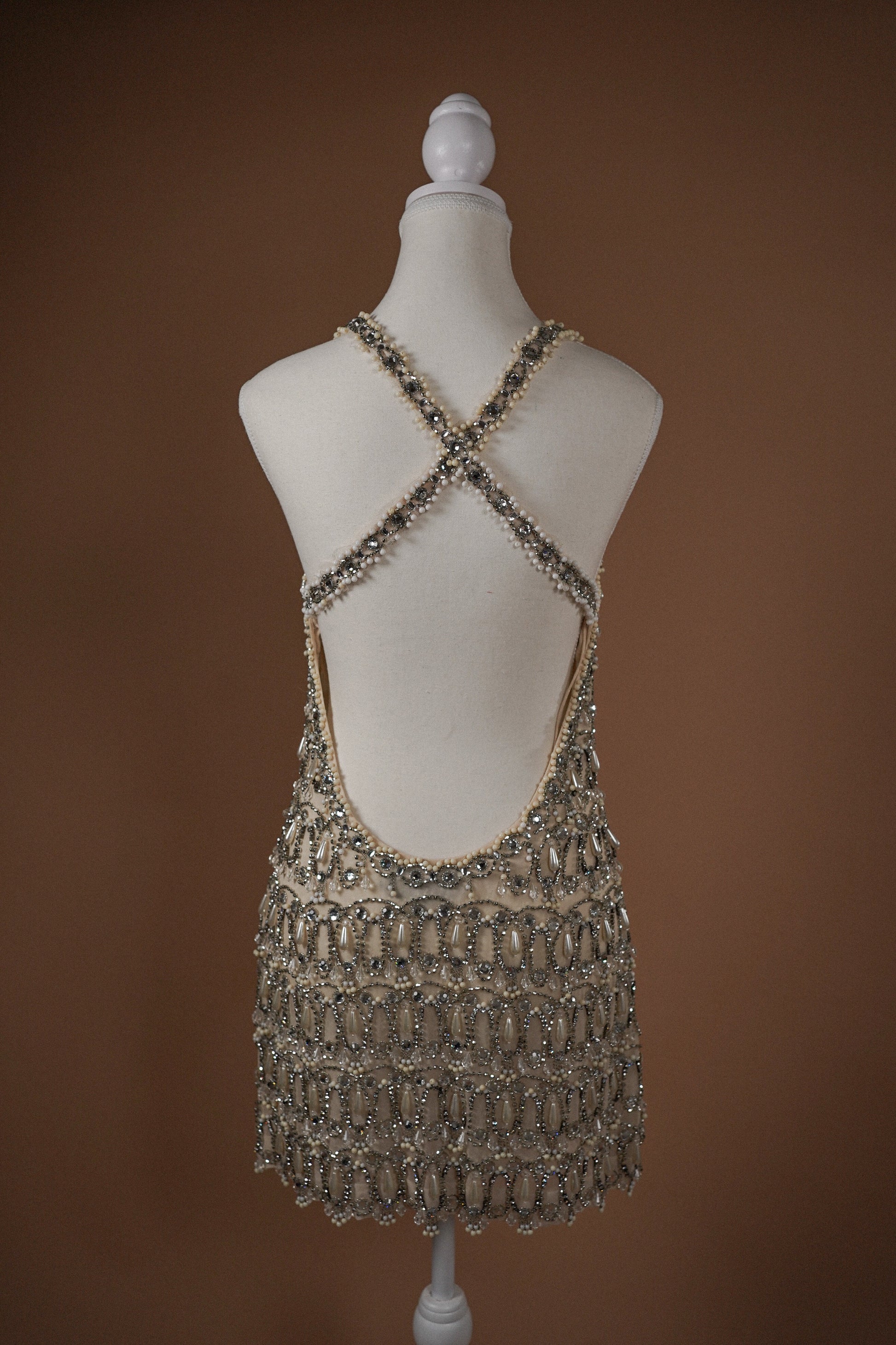 DETAILS: An exquisitely embellished Jenny Packham silk mini dress, dripping in hand-applied crystals, glass beads, and pearl accents. This dazzling piece features a plunging V neckline, an open low back with delicate criss-cross straps, and a fully beaded Art Deco–inspired pattern that catches the light from every angle. Crafted on a silk base and finished with dramatic fringe-style pearl drops, this dress is equal parts Gatsby glamour and modern bridal fantasy.