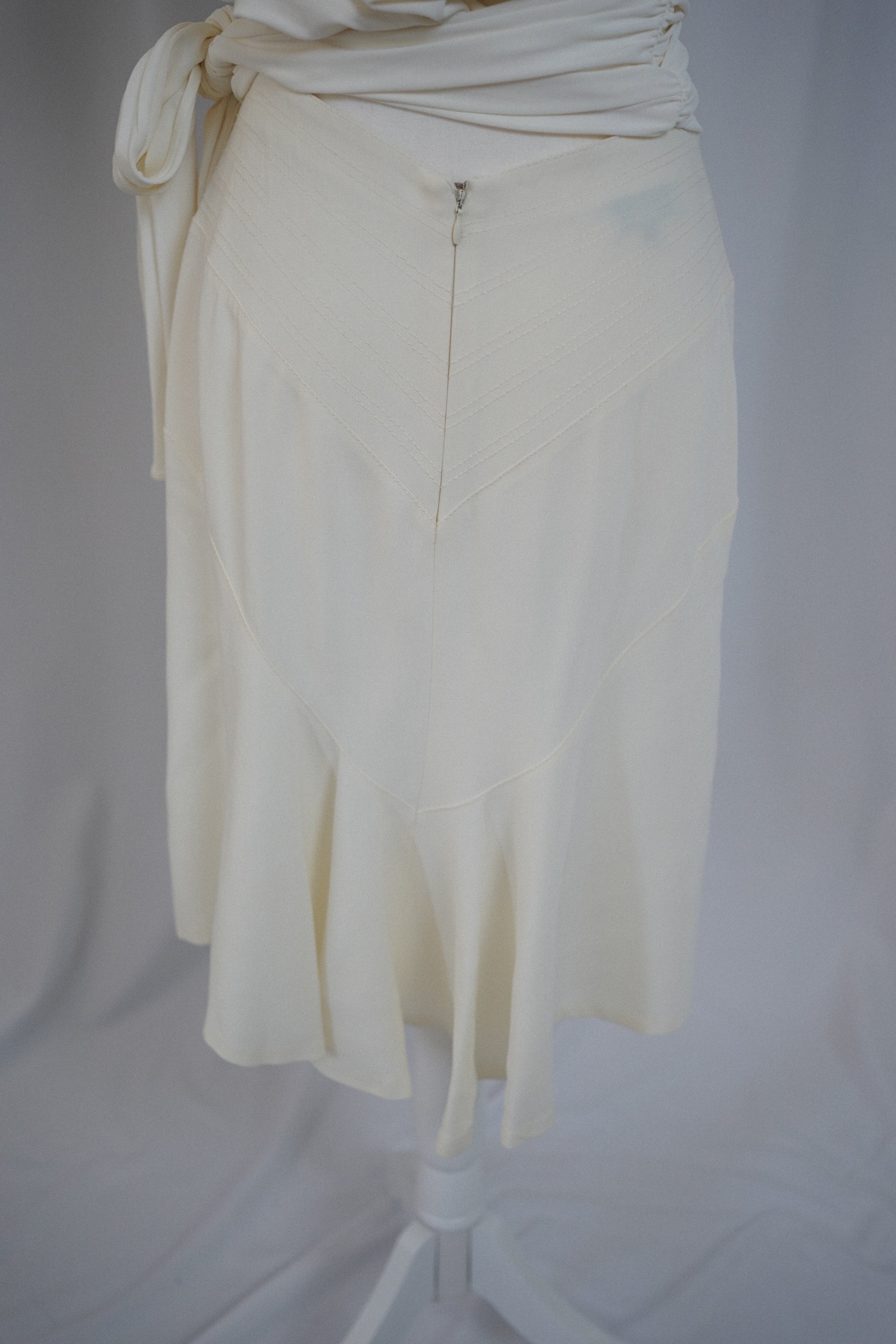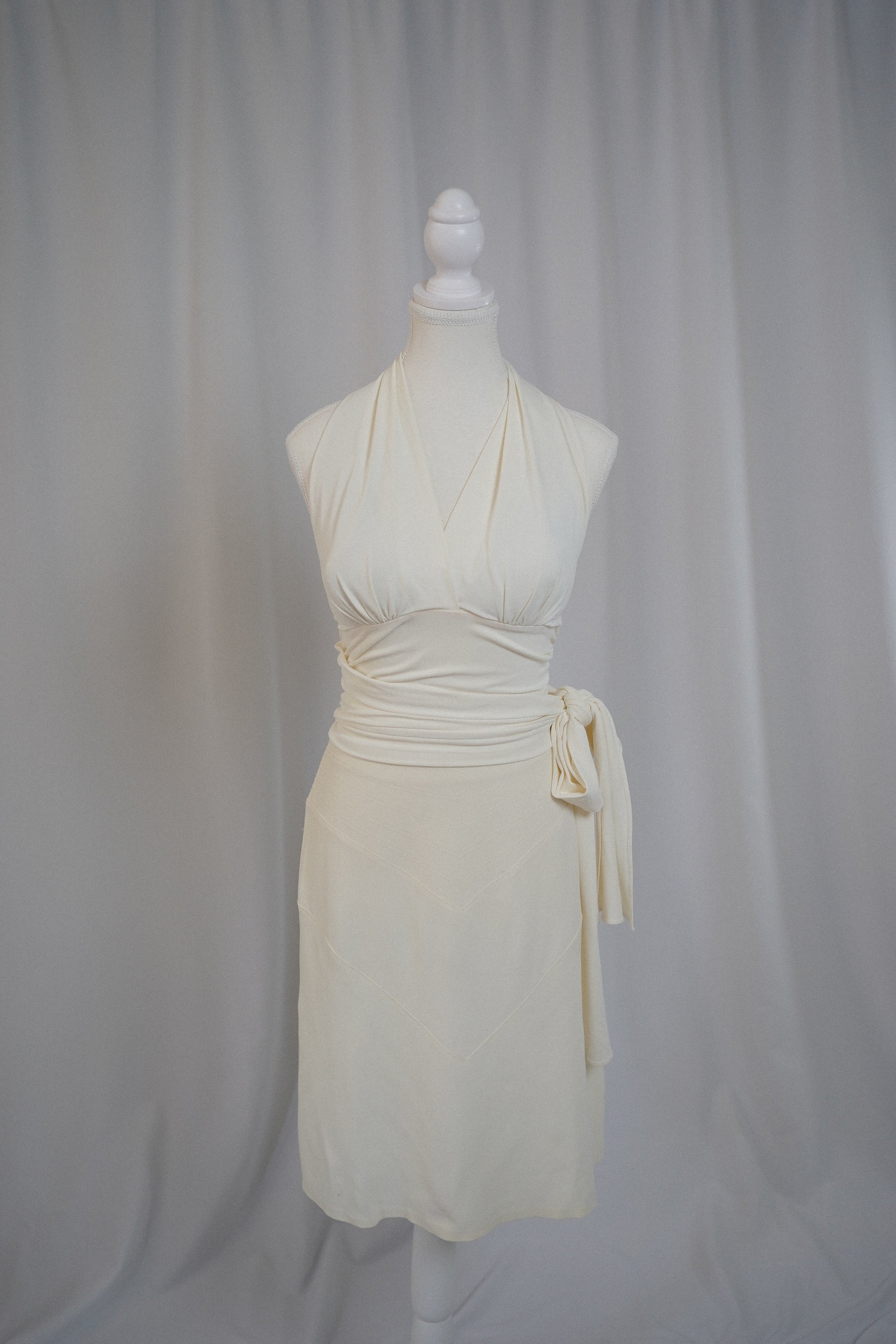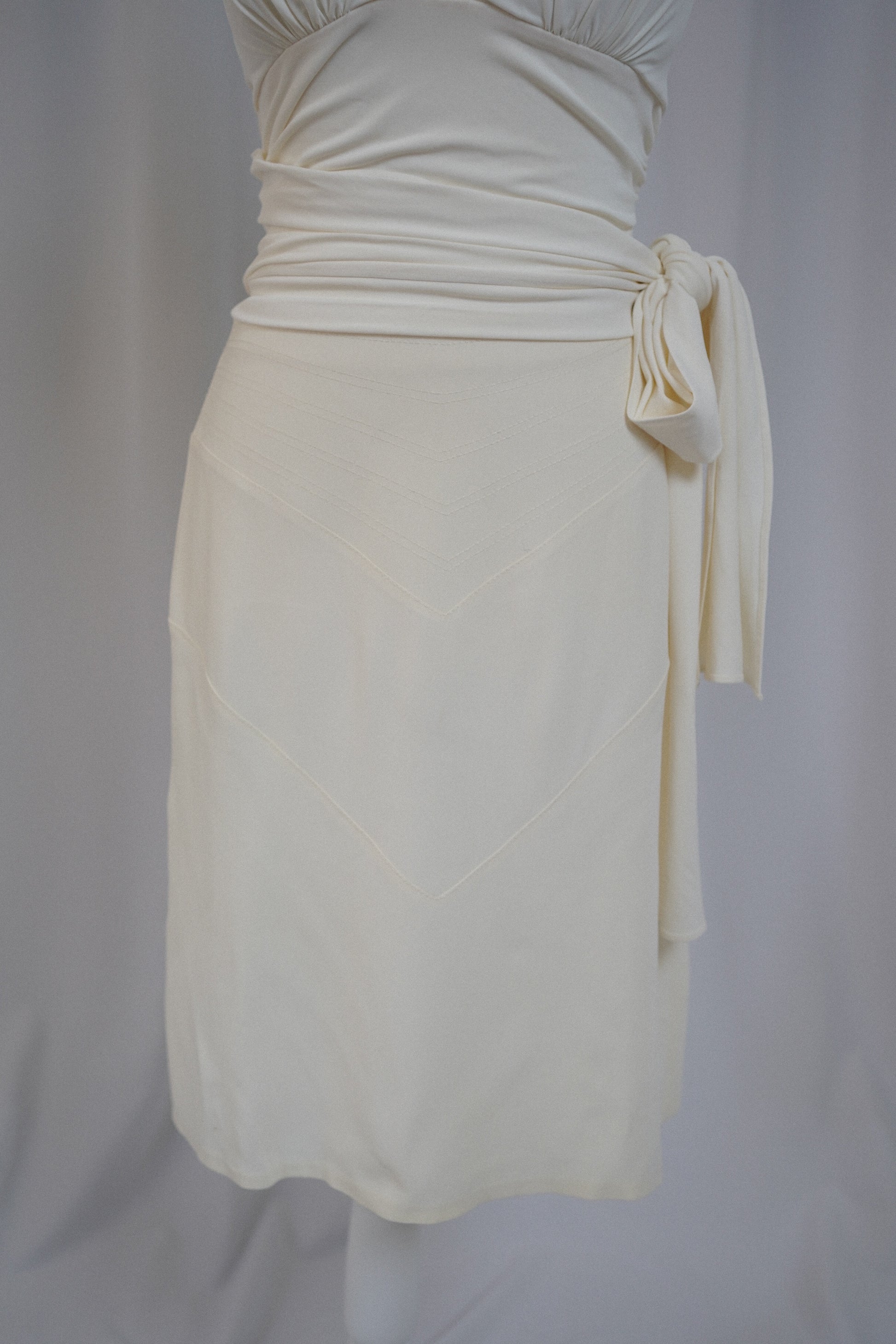 DETAILS: A La Perla two-piece set in a soft ivory, featuring a plunging halter wrap top with side tie and a coordinating midi skirt with sculptural panel seaming. These were not originally sold as a set in my opinion as they have different fabrics. However they’re the same colour and look lovely together.