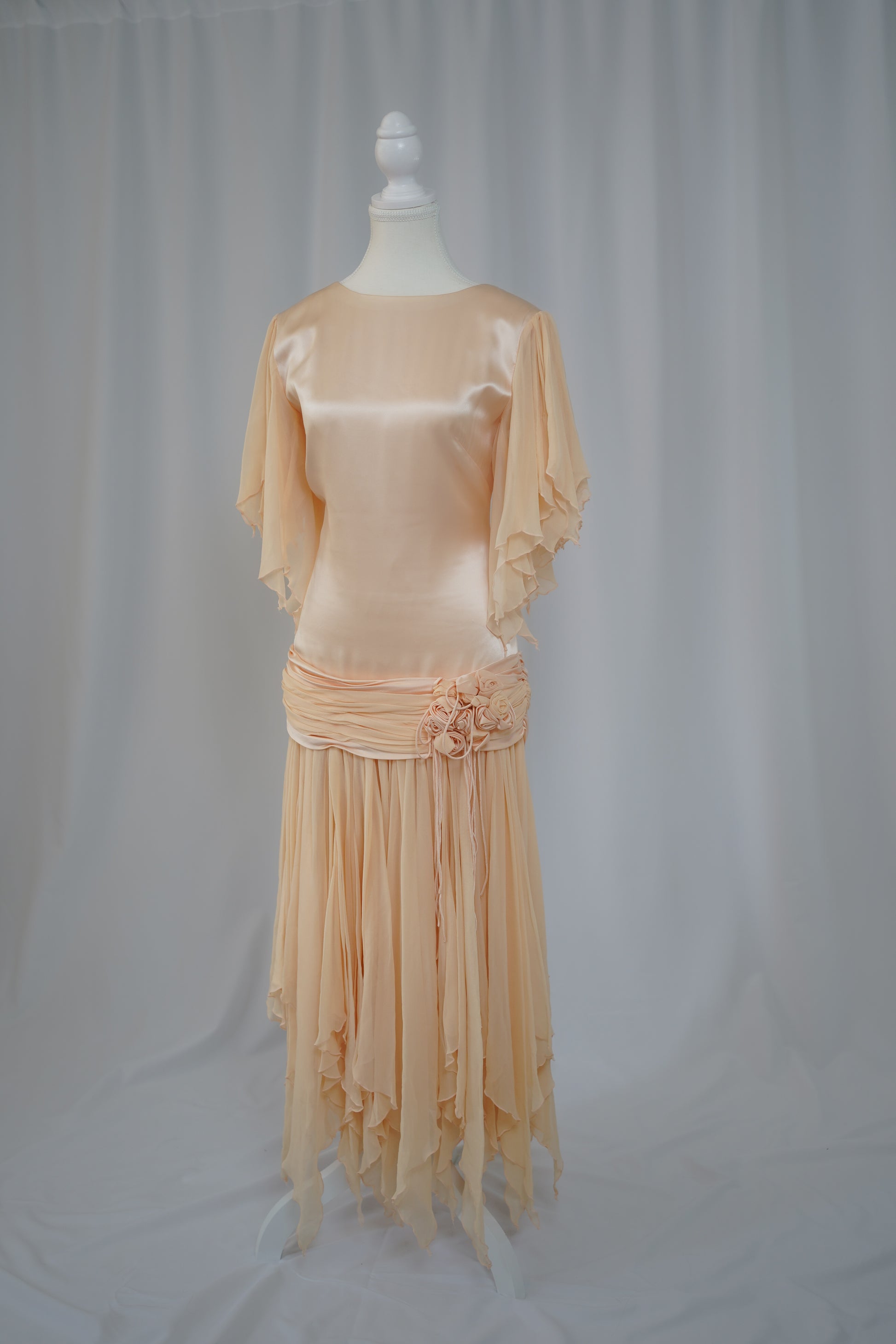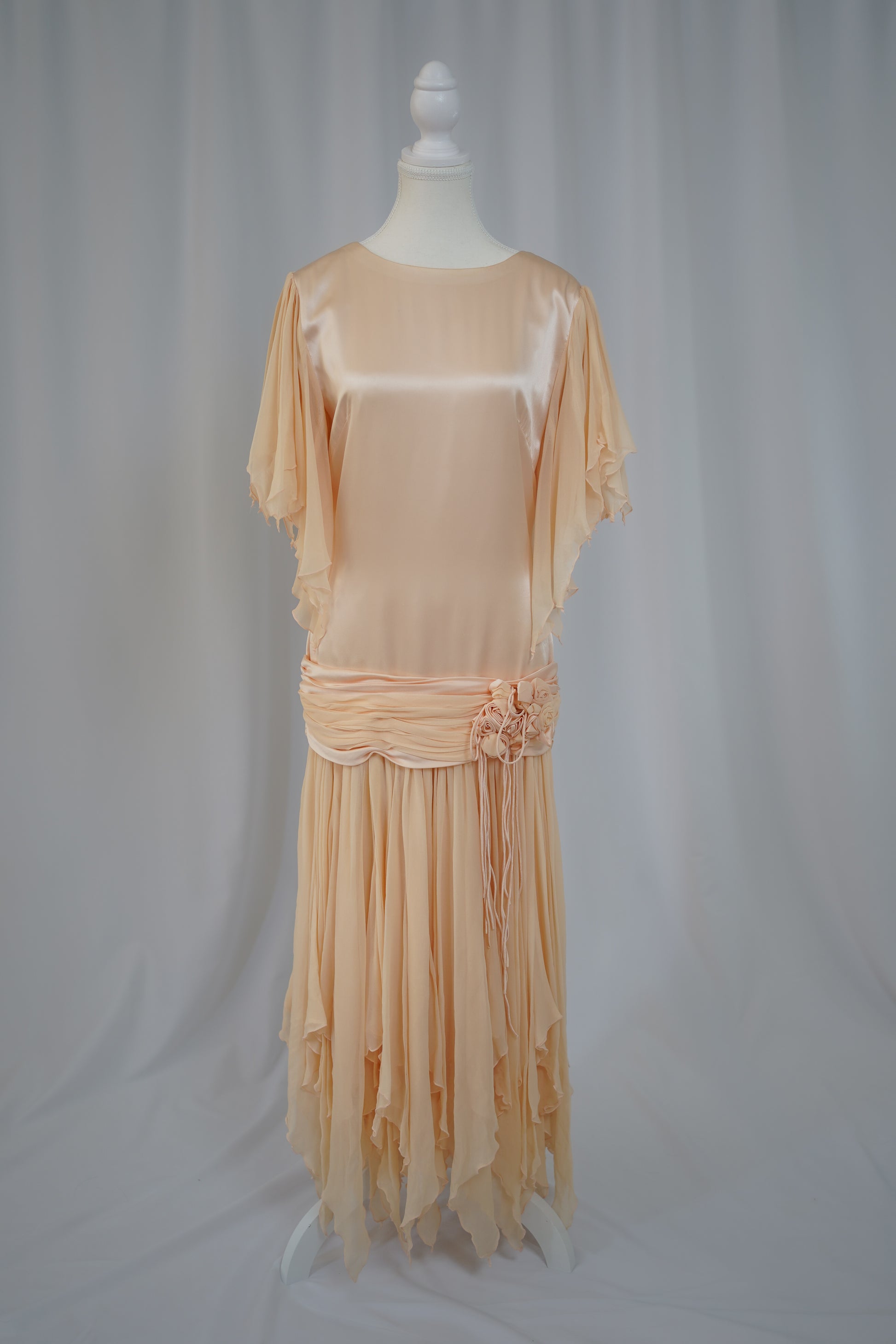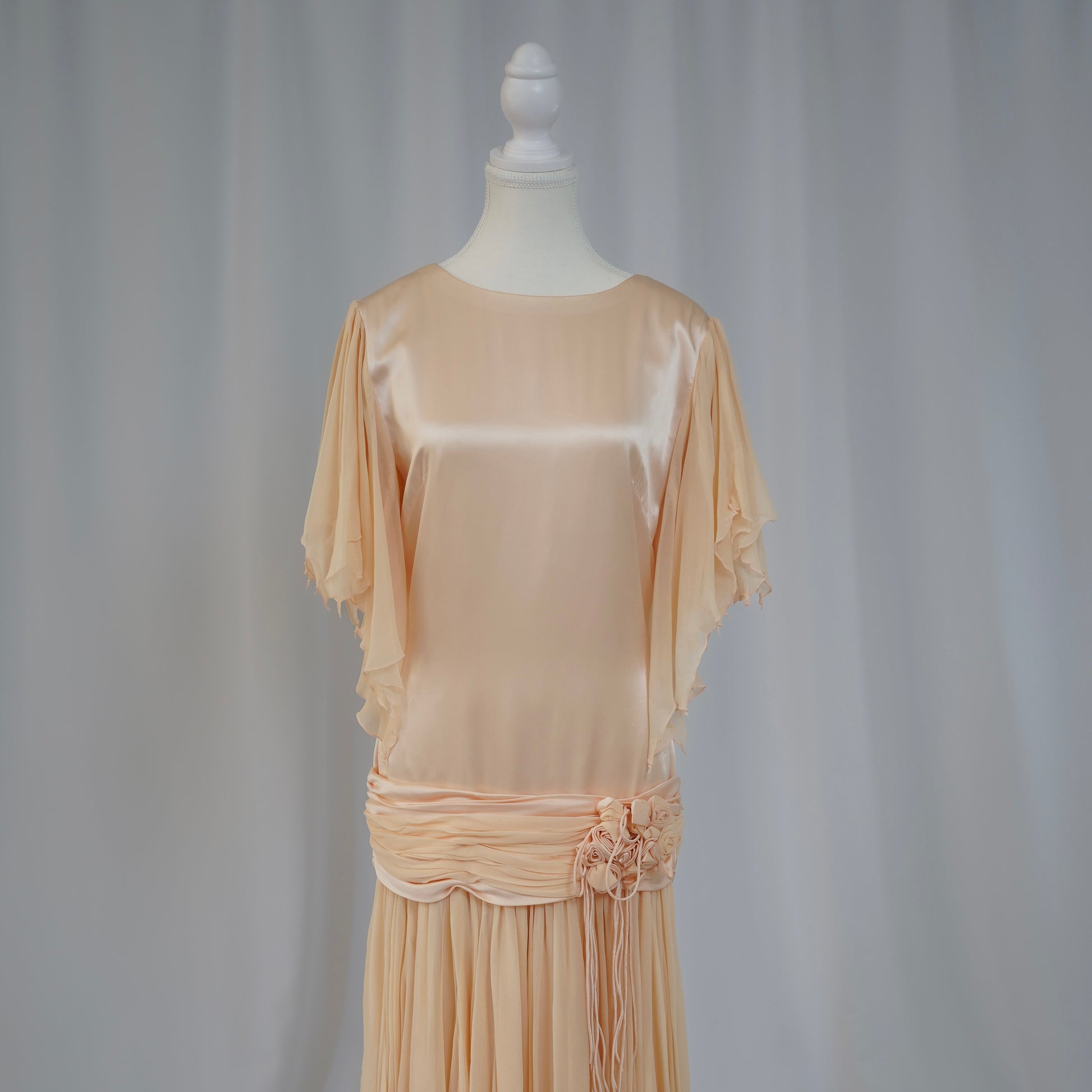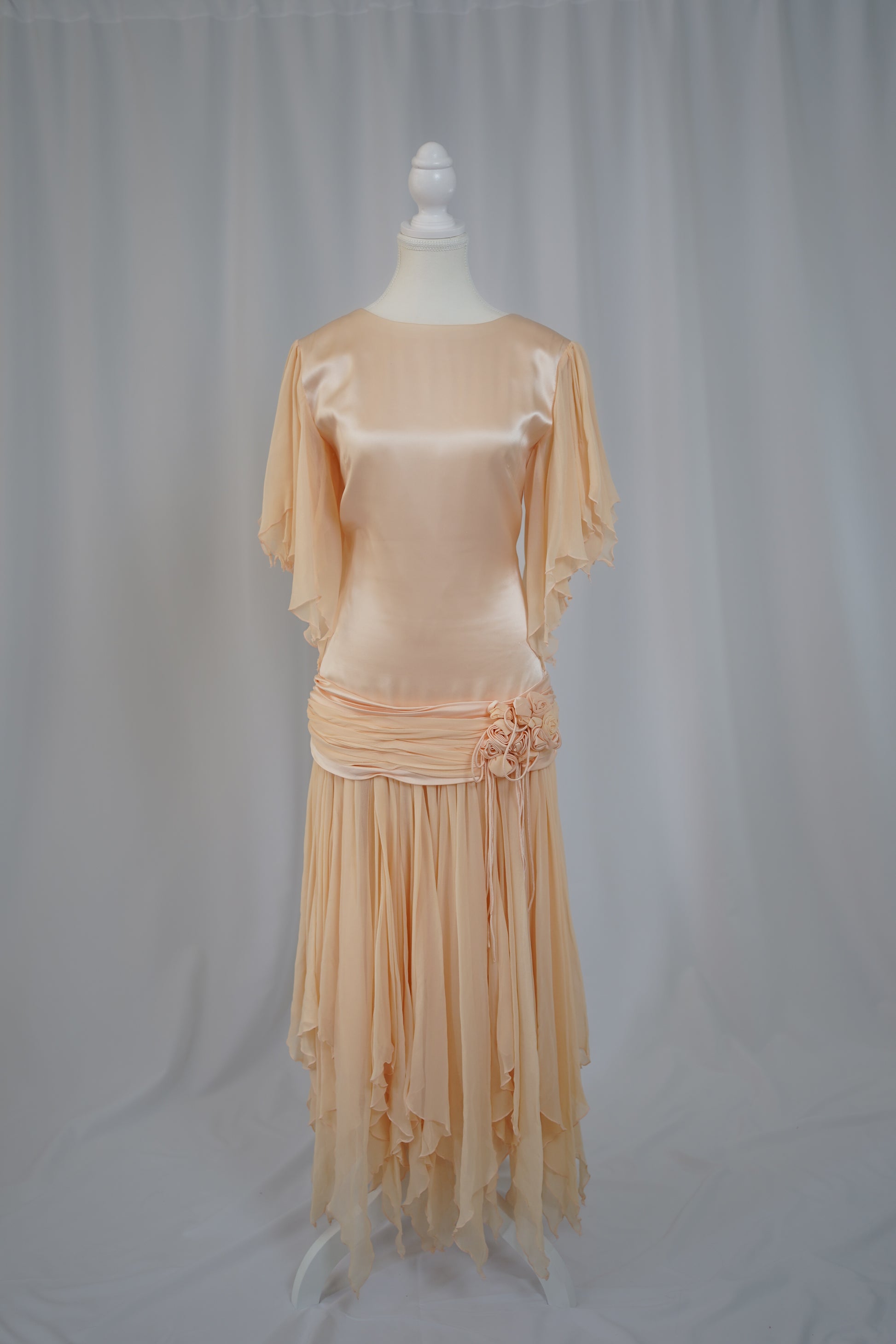 Soft, romantic vintage Lillie Rubin gown rendered in a pale peach silk chiffon with an ethereal, Grecian silhouette. Features flutter sleeves, a gently bloused bodice, and a low-set ruched waist accented with sculptural silk rosette detailing and trailing ties. The skirt falls in layered, handkerchief-style chiffon panels that move beautifully with wear.