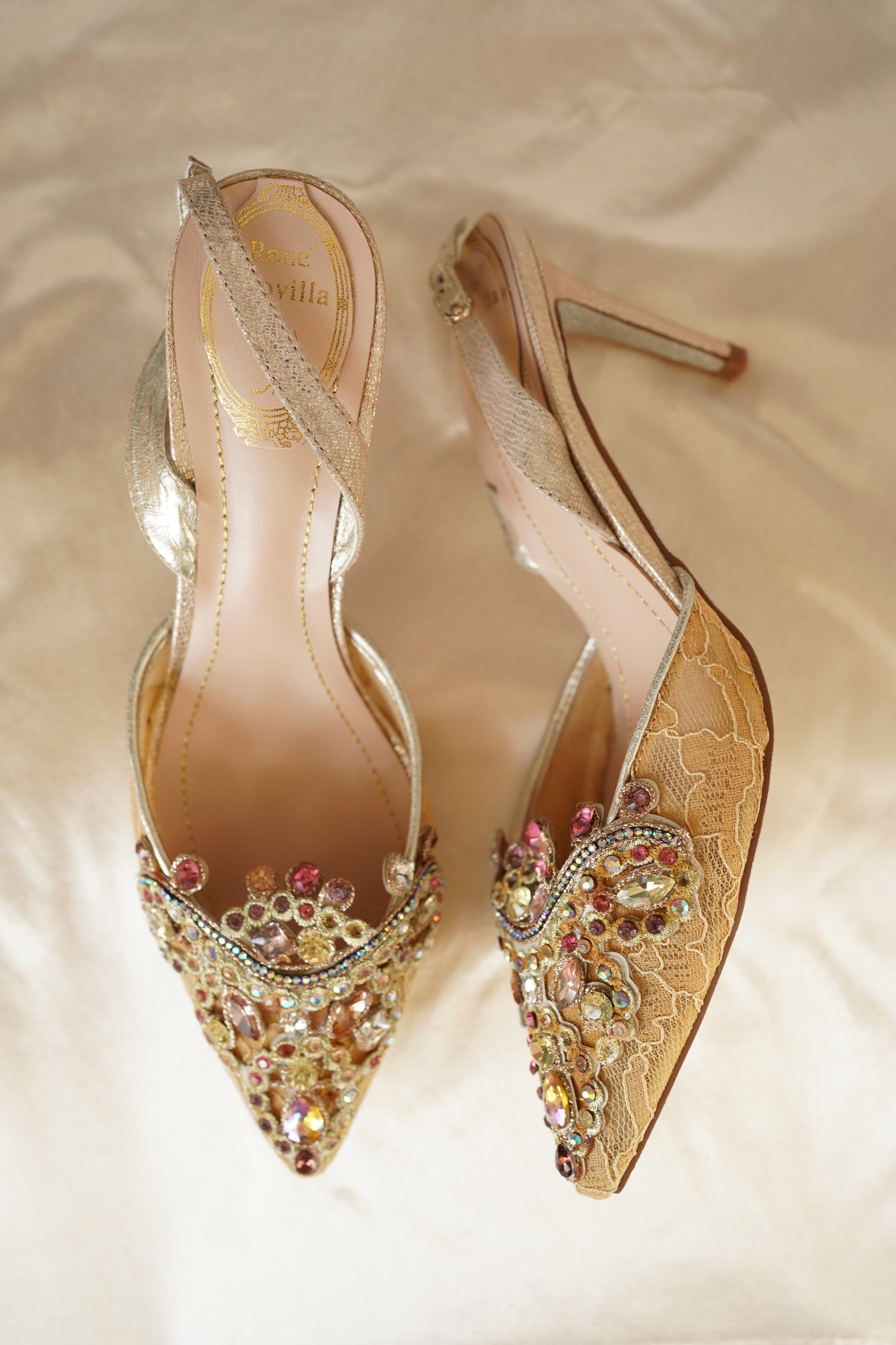 Gold lace, crystals and rhinestones, metallic leather, glittered sole.