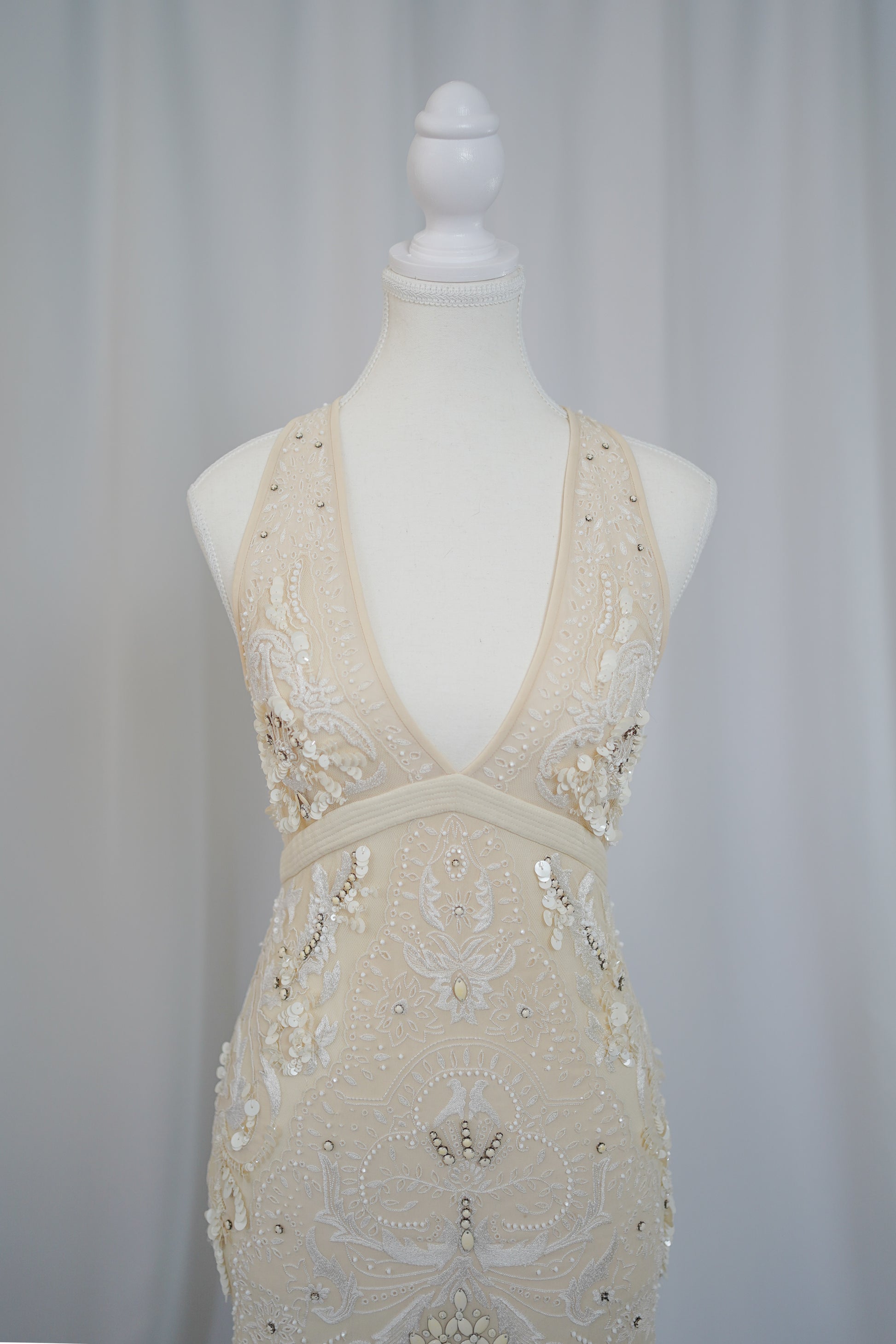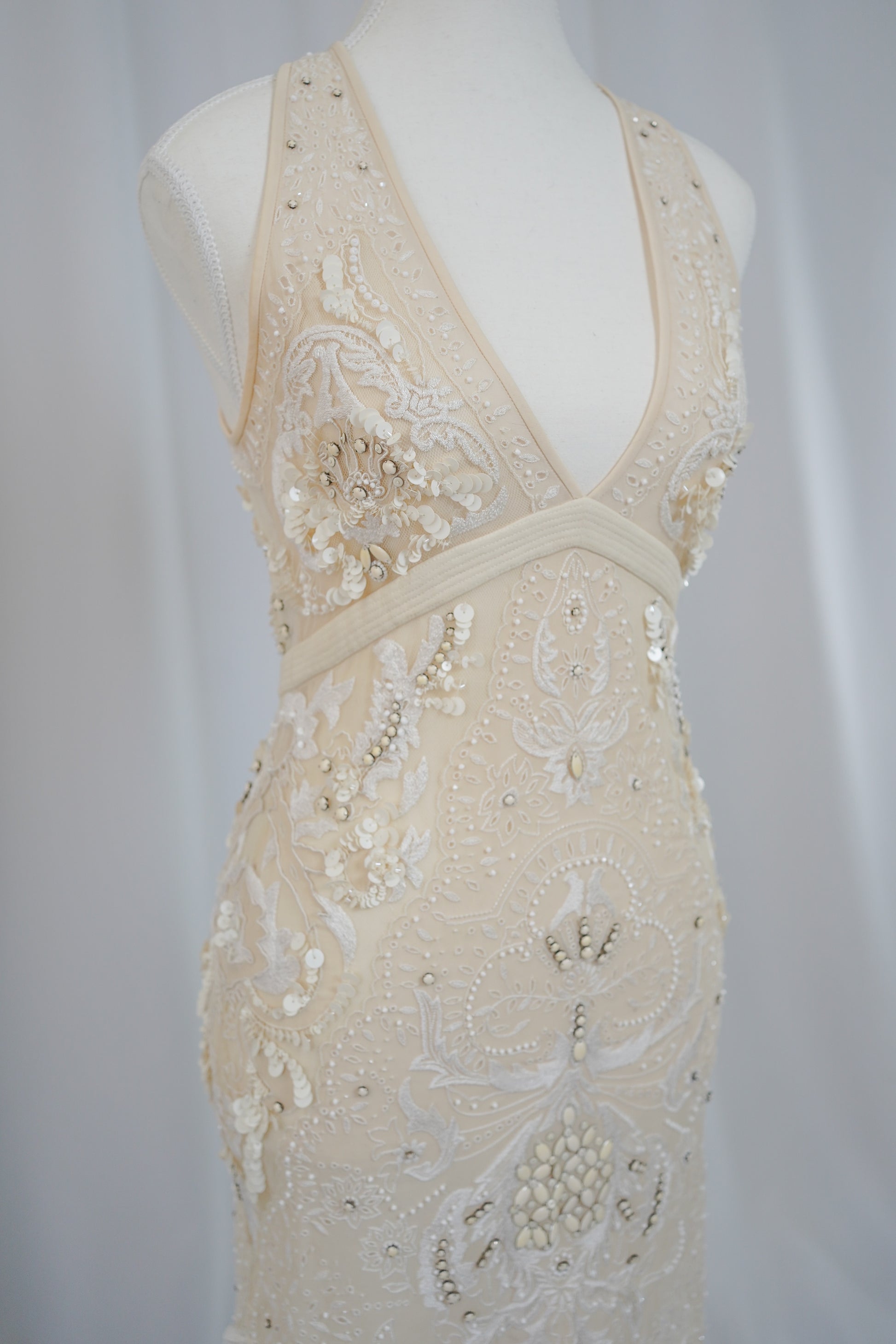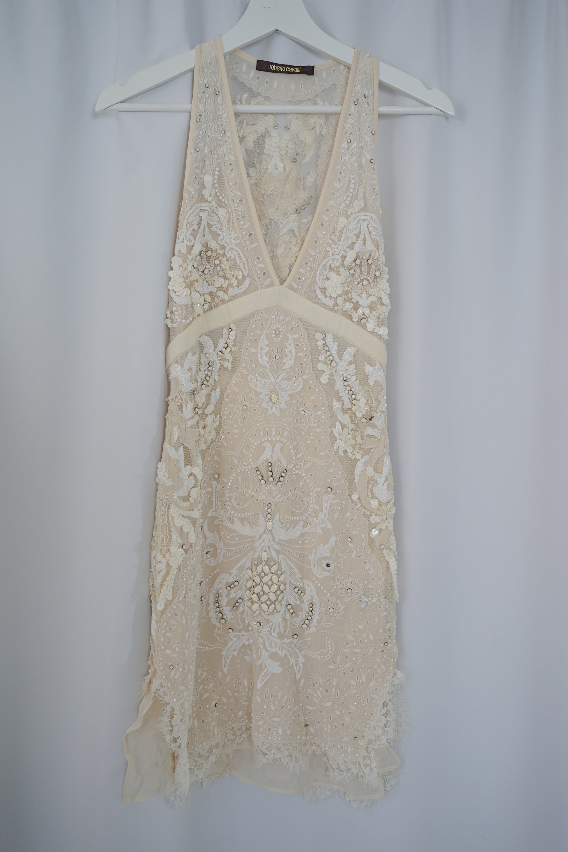 A rare Roberto Cavalli Resort 2013 embellished mini dress inspired by the collection’s porcelain and botanical motifs. Crafted in sheer mesh with intricate ivory embroidery, sequins, beadwork, and crystal accents, this mini version features a plunging V neckline, racerback silhouette, and softly scalloped hem. Part of Cavalli’s Resort 2013 presentation and worn by multiple celebrities. A standout bridal piece—perfect for a rehearsal dinner, second look, bachelorette, or destination celebration.