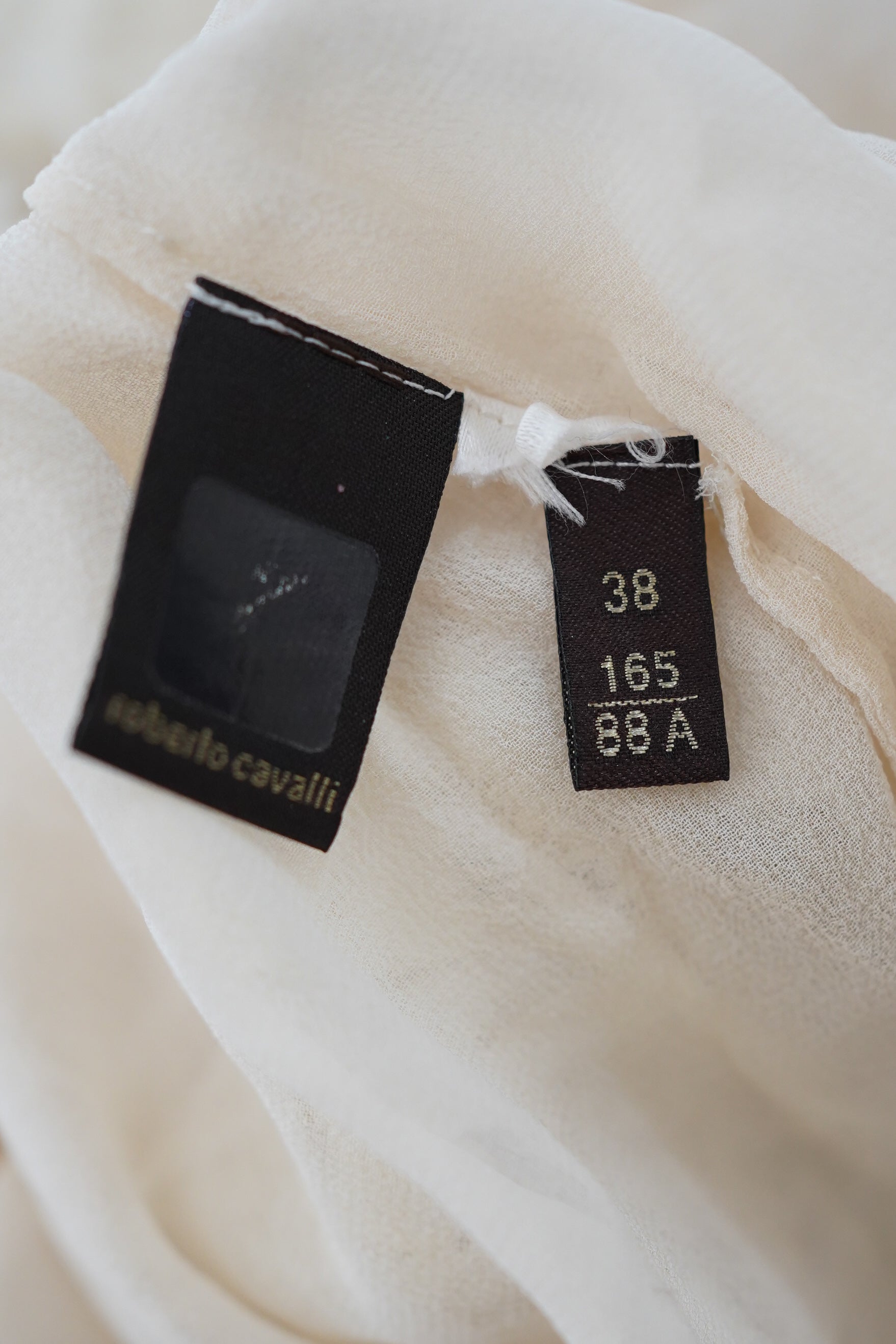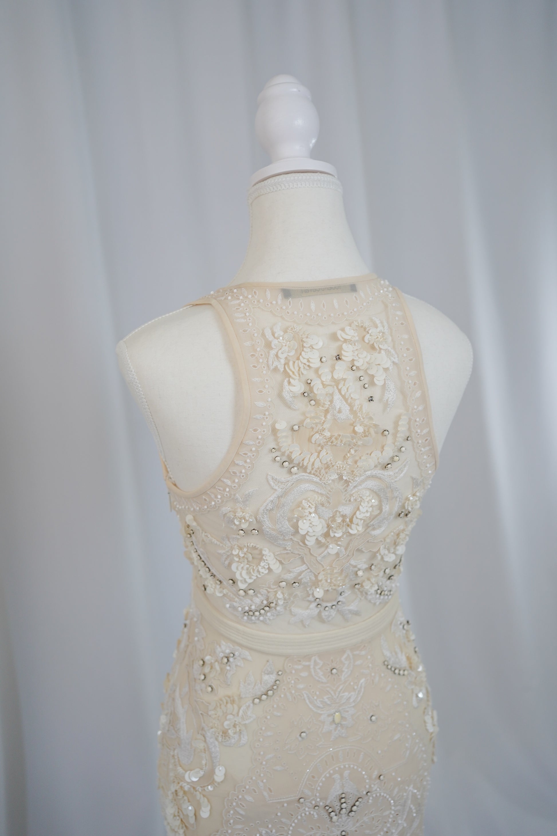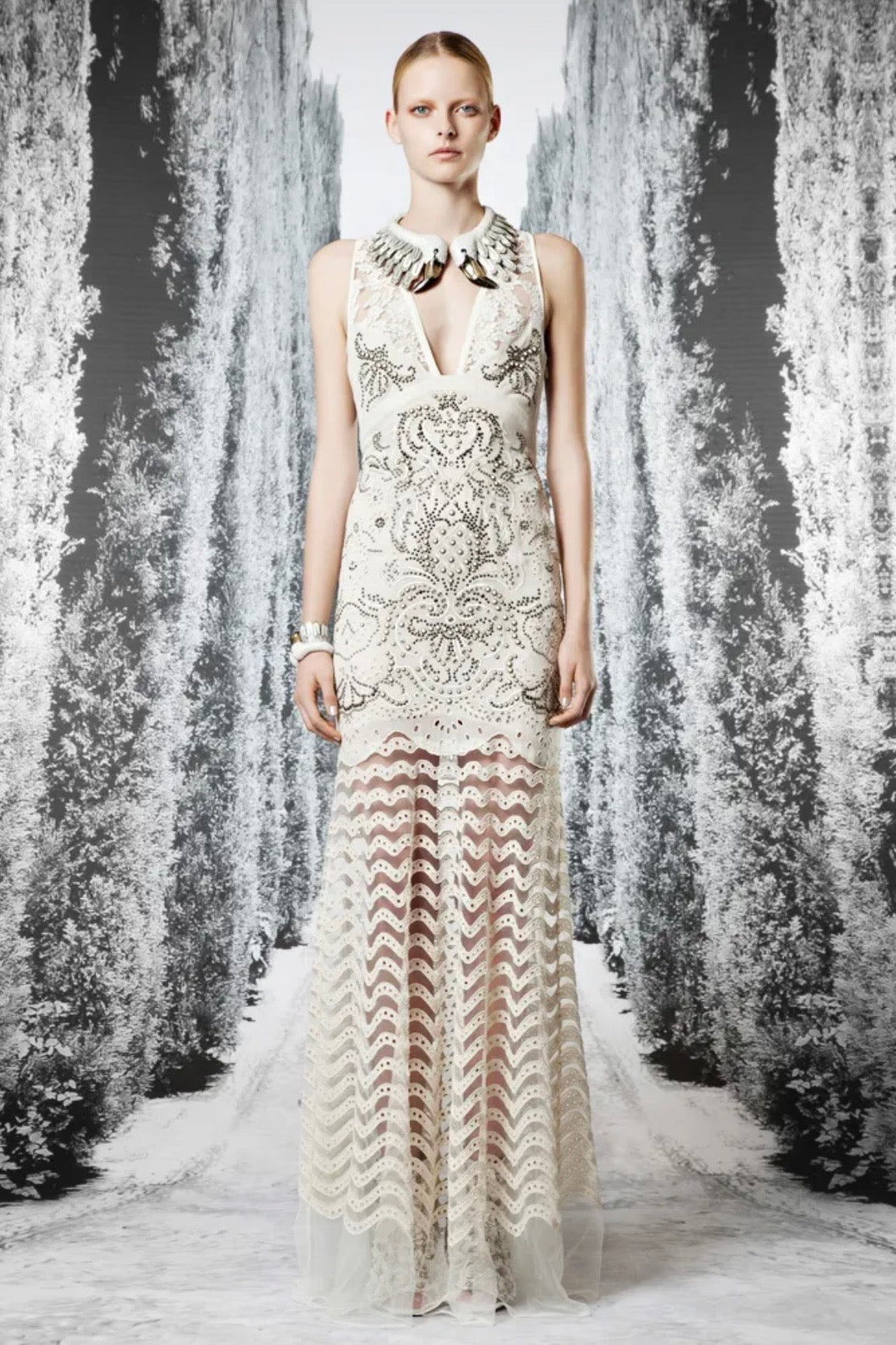 A rare Roberto Cavalli Resort 2013 embellished mini dress inspired by the collection’s porcelain and botanical motifs. Crafted in sheer mesh with intricate ivory embroidery, sequins, beadwork, and crystal accents, this mini version features a plunging V neckline, racerback silhouette, and softly scalloped hem. Part of Cavalli’s Resort 2013 presentation and worn by multiple celebrities. A standout bridal piece—perfect for a rehearsal dinner, second look, bachelorette, or destination celebration.