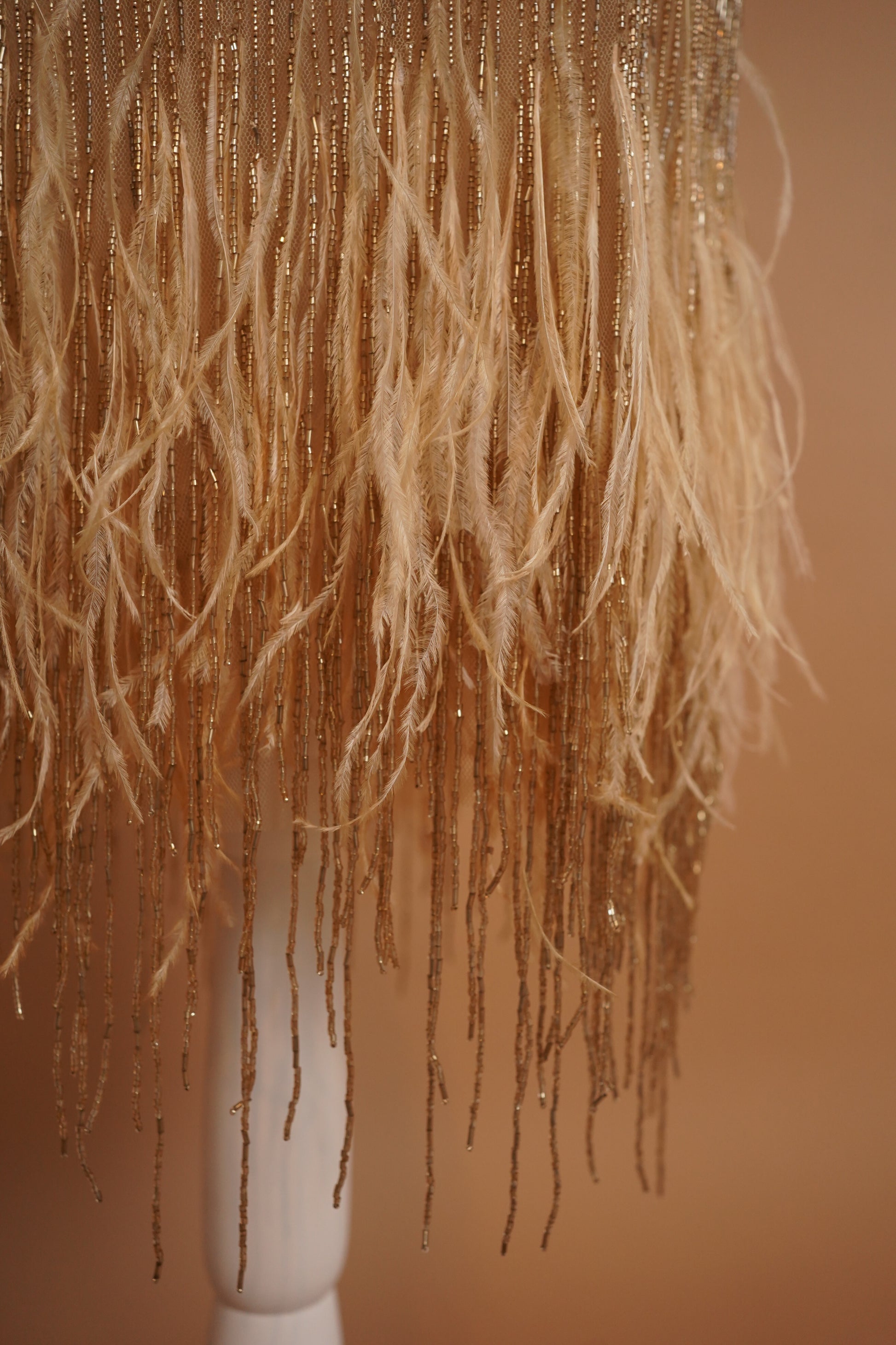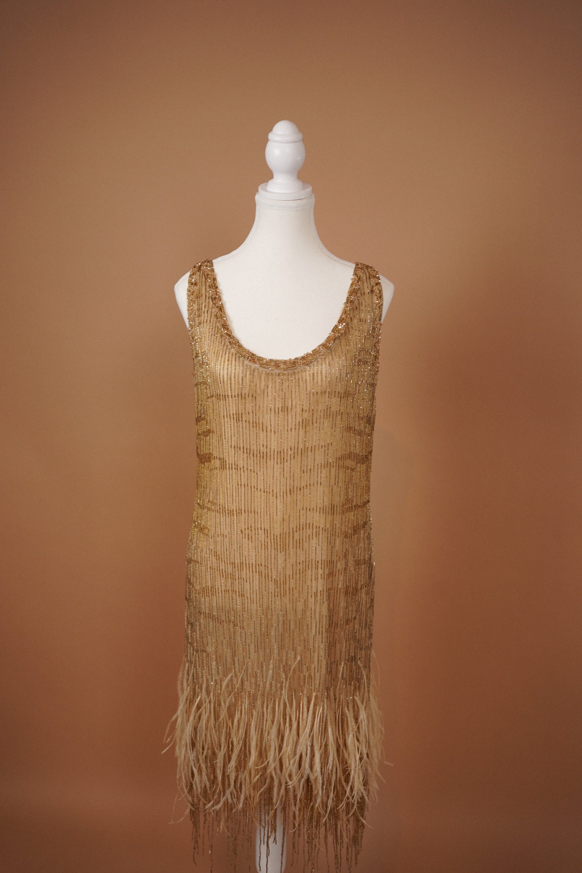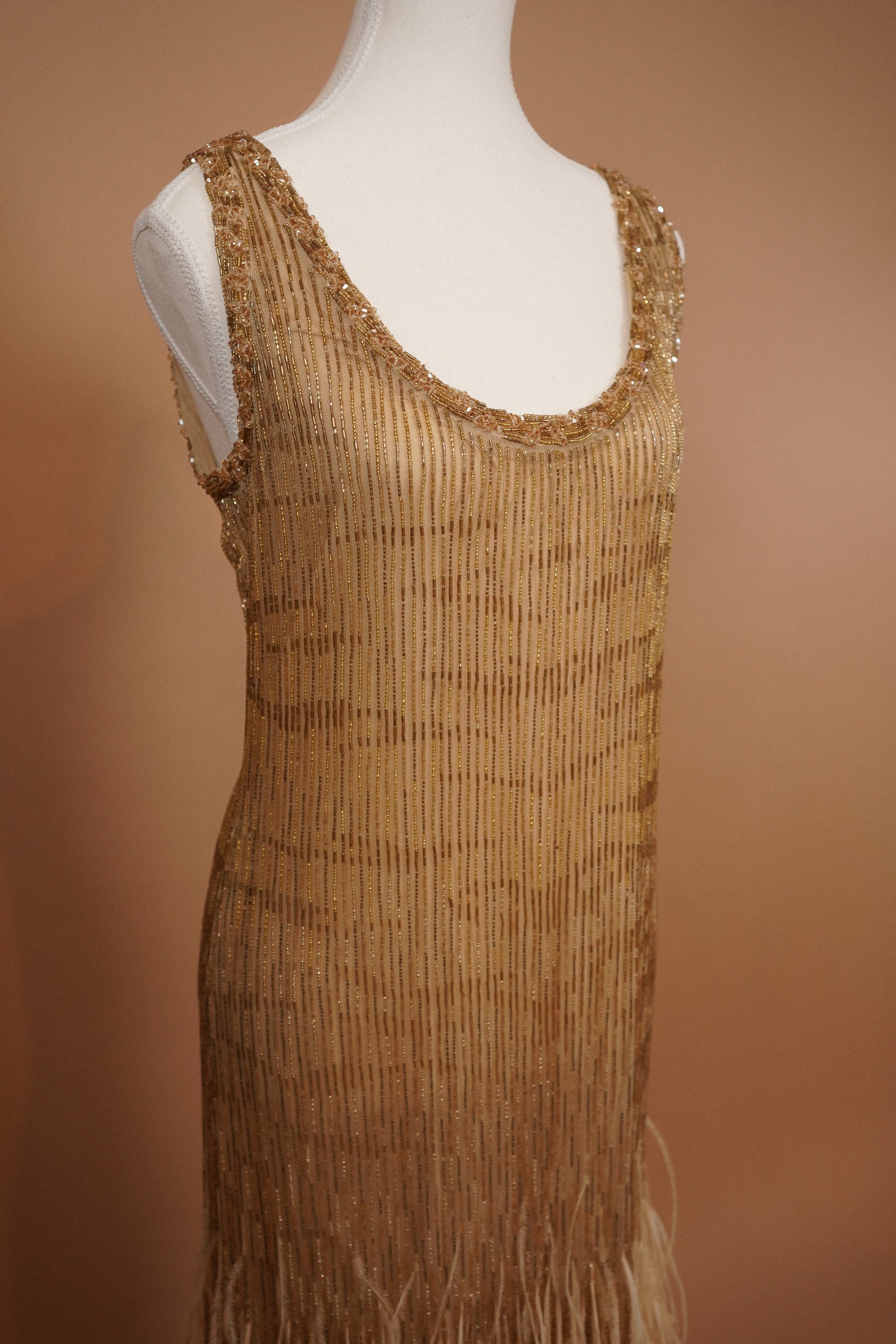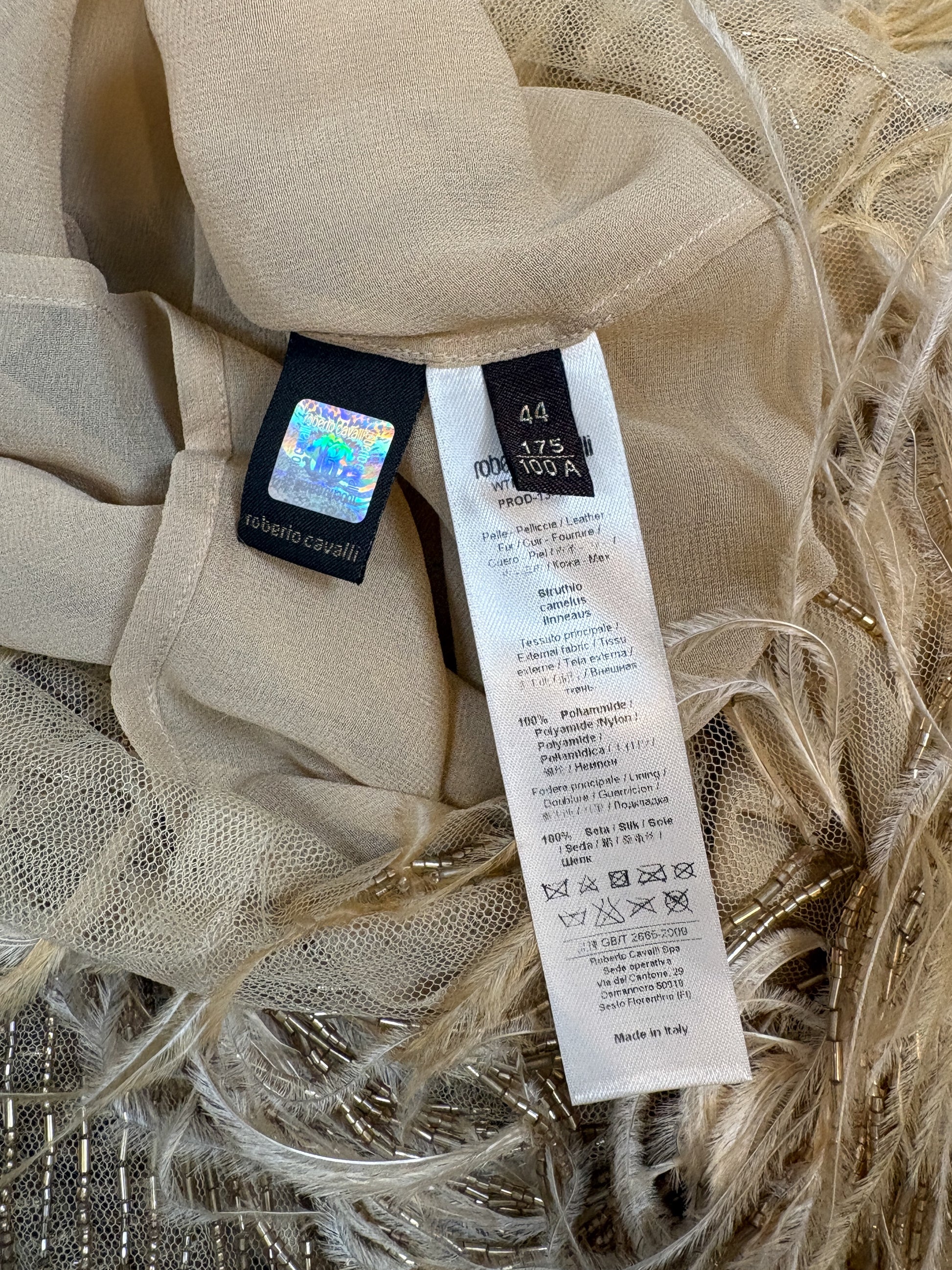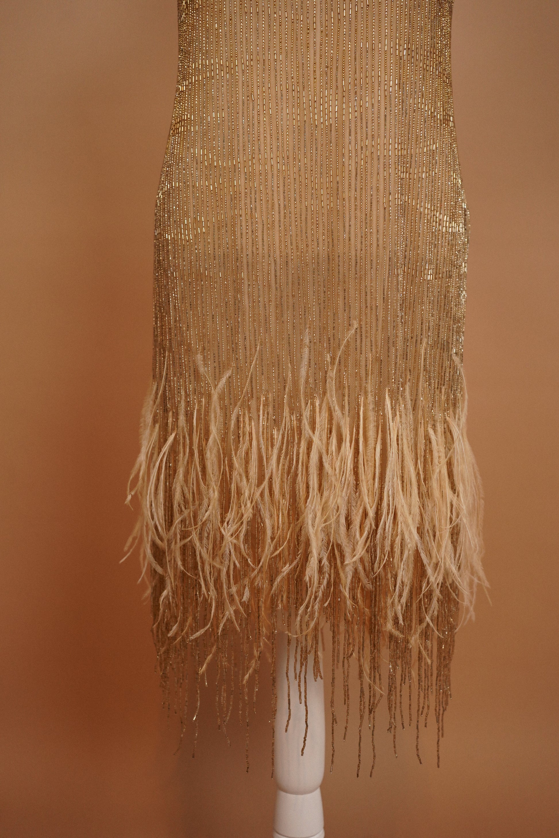 A stunning Roberto Cavalli shift dress crafted in a nude mesh densely embellished with vertical gold bugle beadwork and finished with a dramatic feathered fringe hem. The silhouette had a subtle animalistic tiger pattern and skims the body with a relaxed, fluid fit, allowing the beadwork and movement of the fringe to take center stage. A true statement piece with strong flapper-era glamour, perfect for a bridal second look, reception, or black-tie moment.