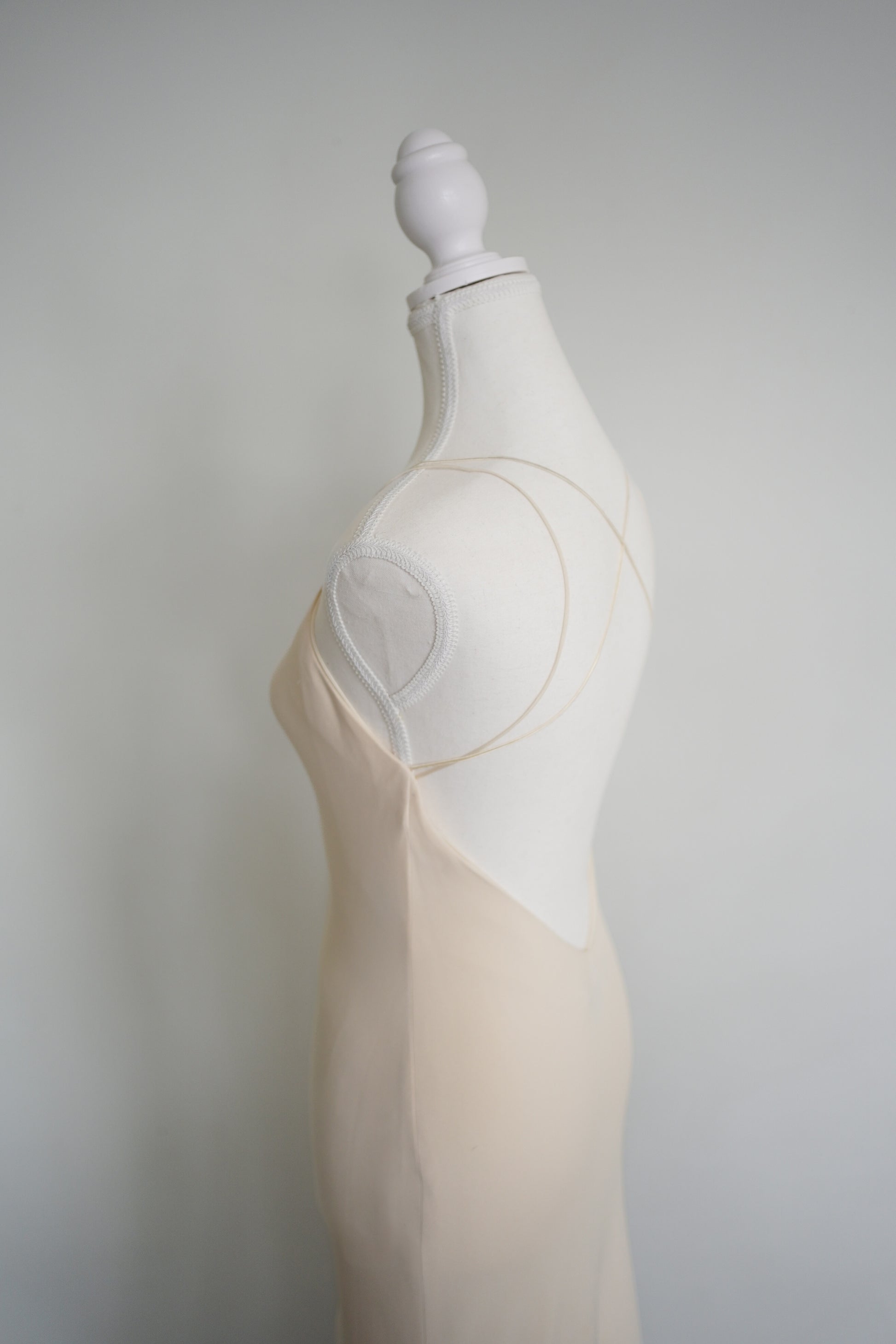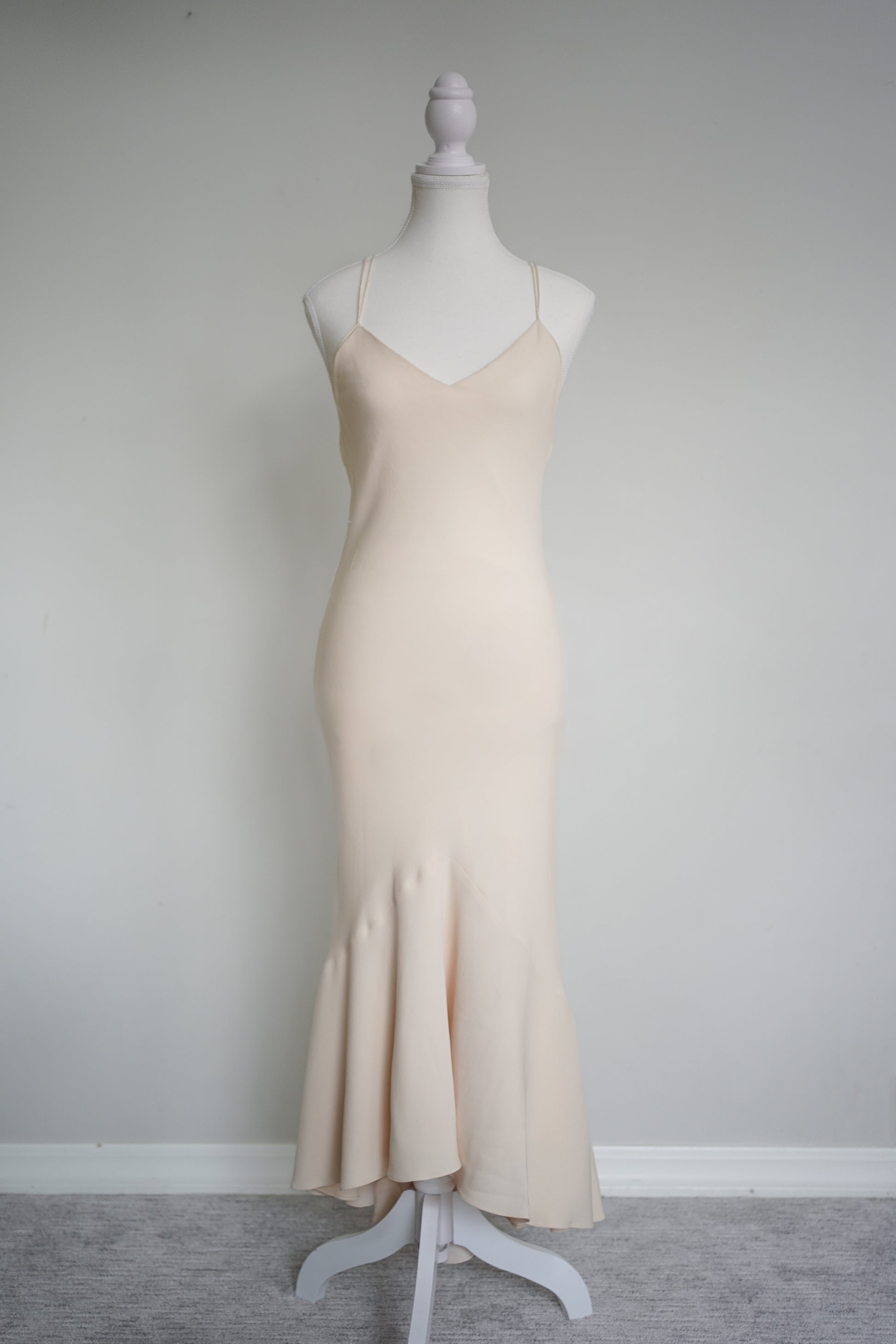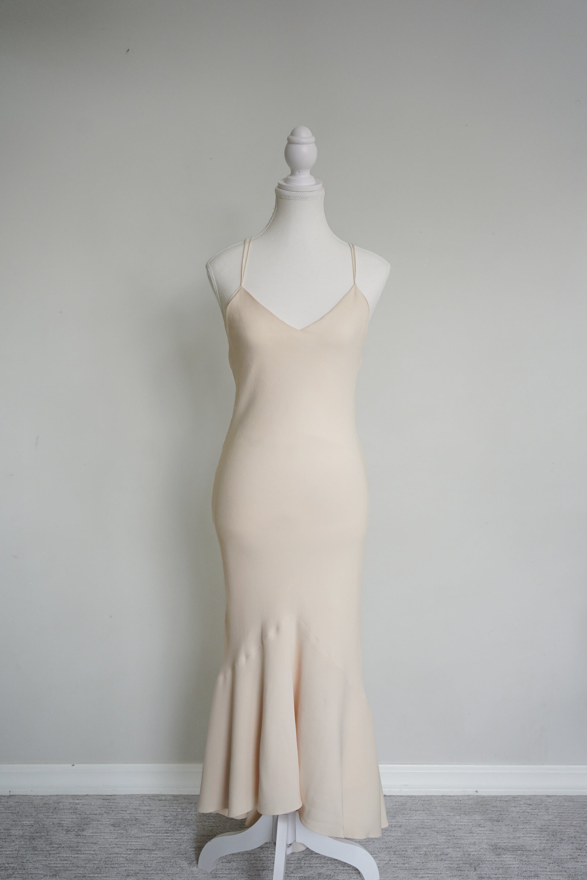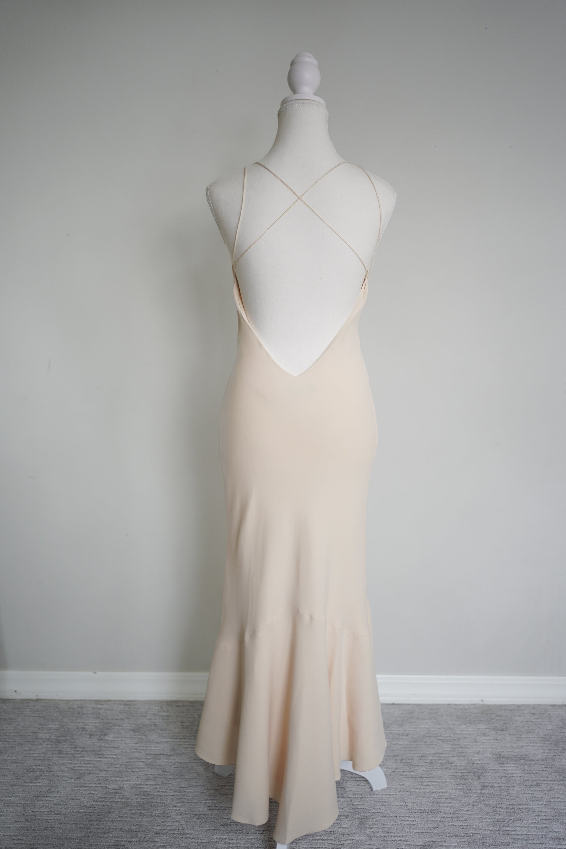 A stunning minimalist low back slip gown from Ralph Lauren Collection, crafted in a luxe cream silk blend with a curve-skimming silhouette. Features delicate double spaghetti straps, a beautiful open criss-cross low back, and a soft fluted hem that moves beautifully. The mannequin doesn’t do this one justice—on the body it drapes and moves beautifully.