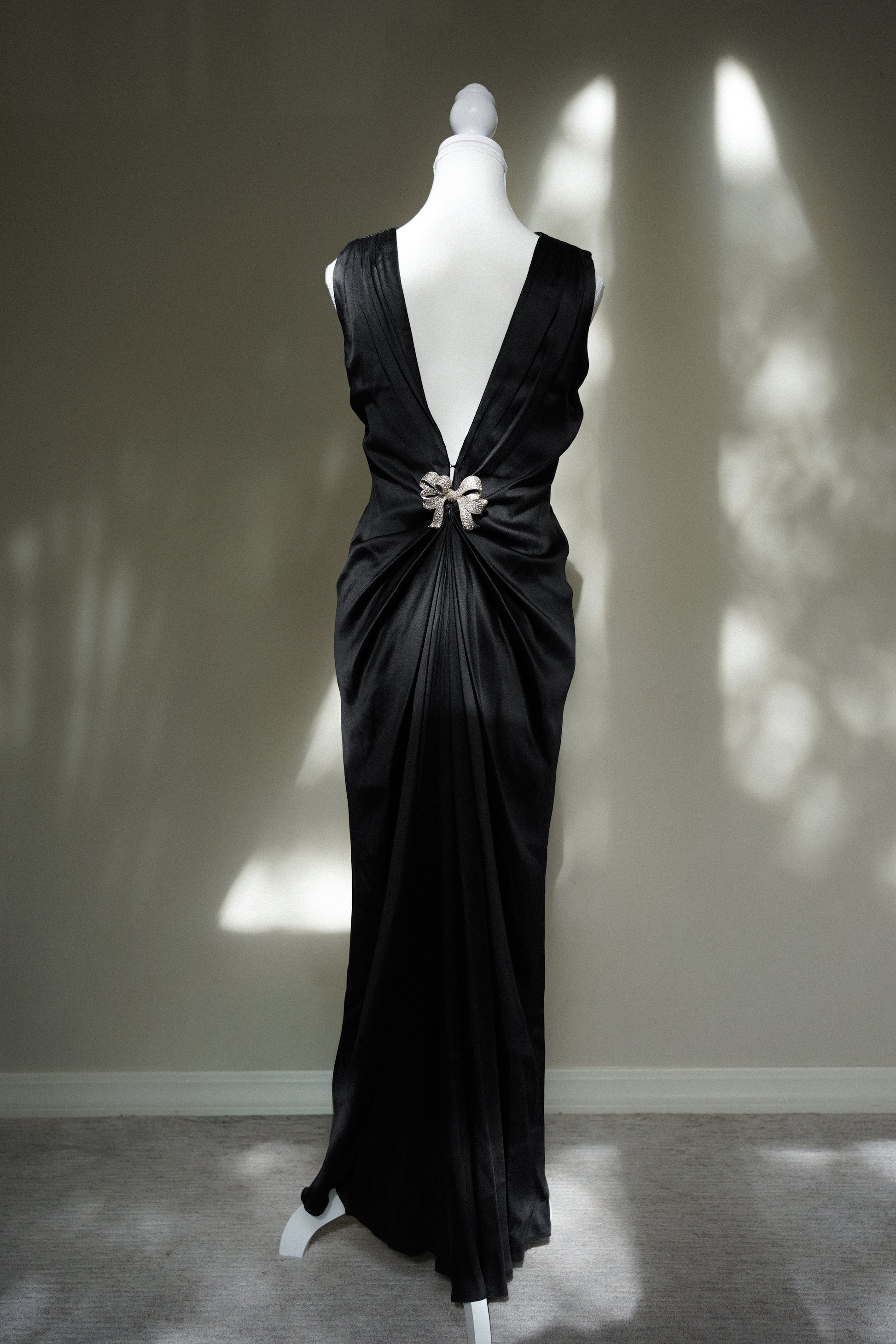 Elegant vintage Oscar de la Renta evening gown in black crepe-backed satin. Features a sculptural silhouette with a high bateau neckline, plunging V-back, and gathered waistline accented by the original Barrera rhinestone bow brooch. A striking example of Oscar de la Renta’s timeless glamour and couture-level craftsmanship.