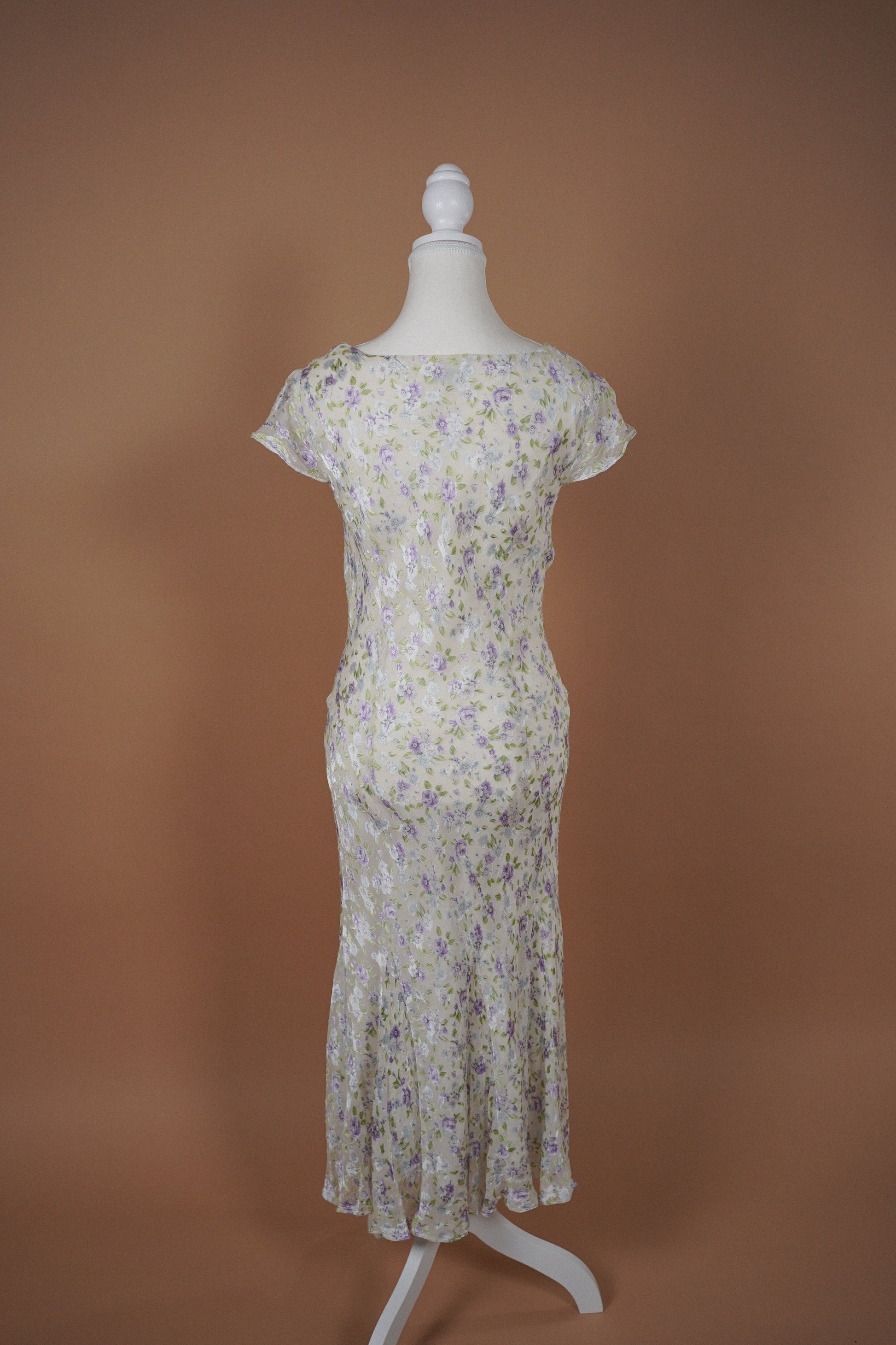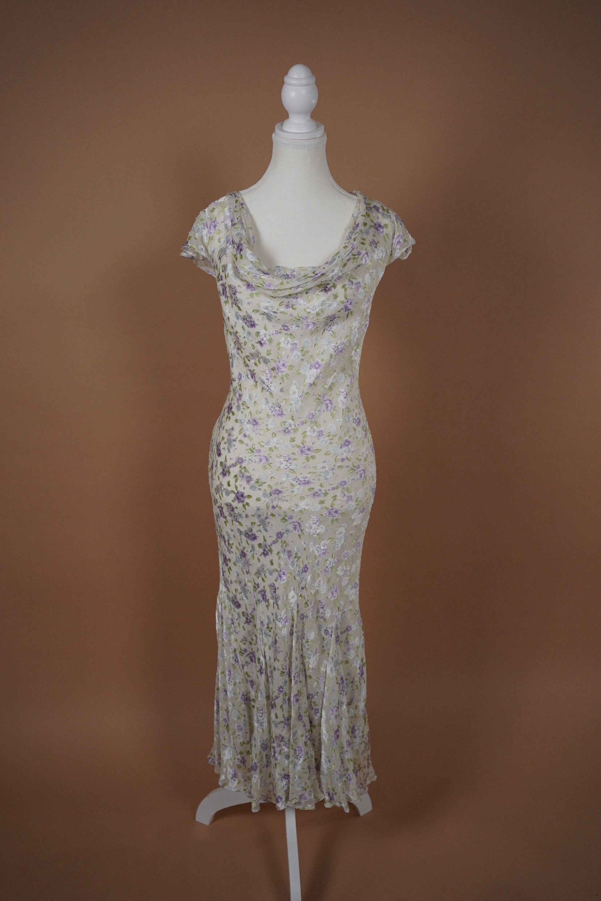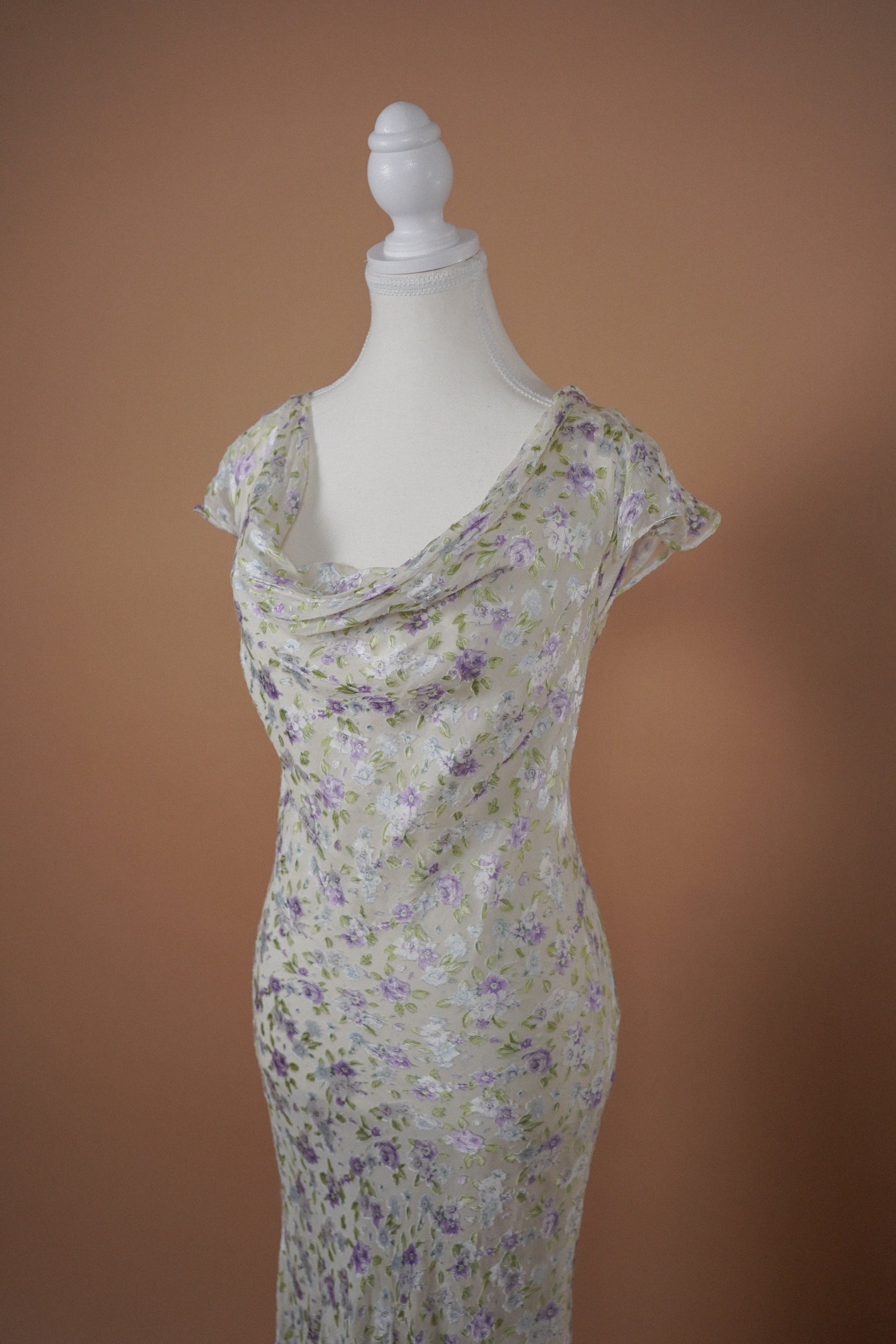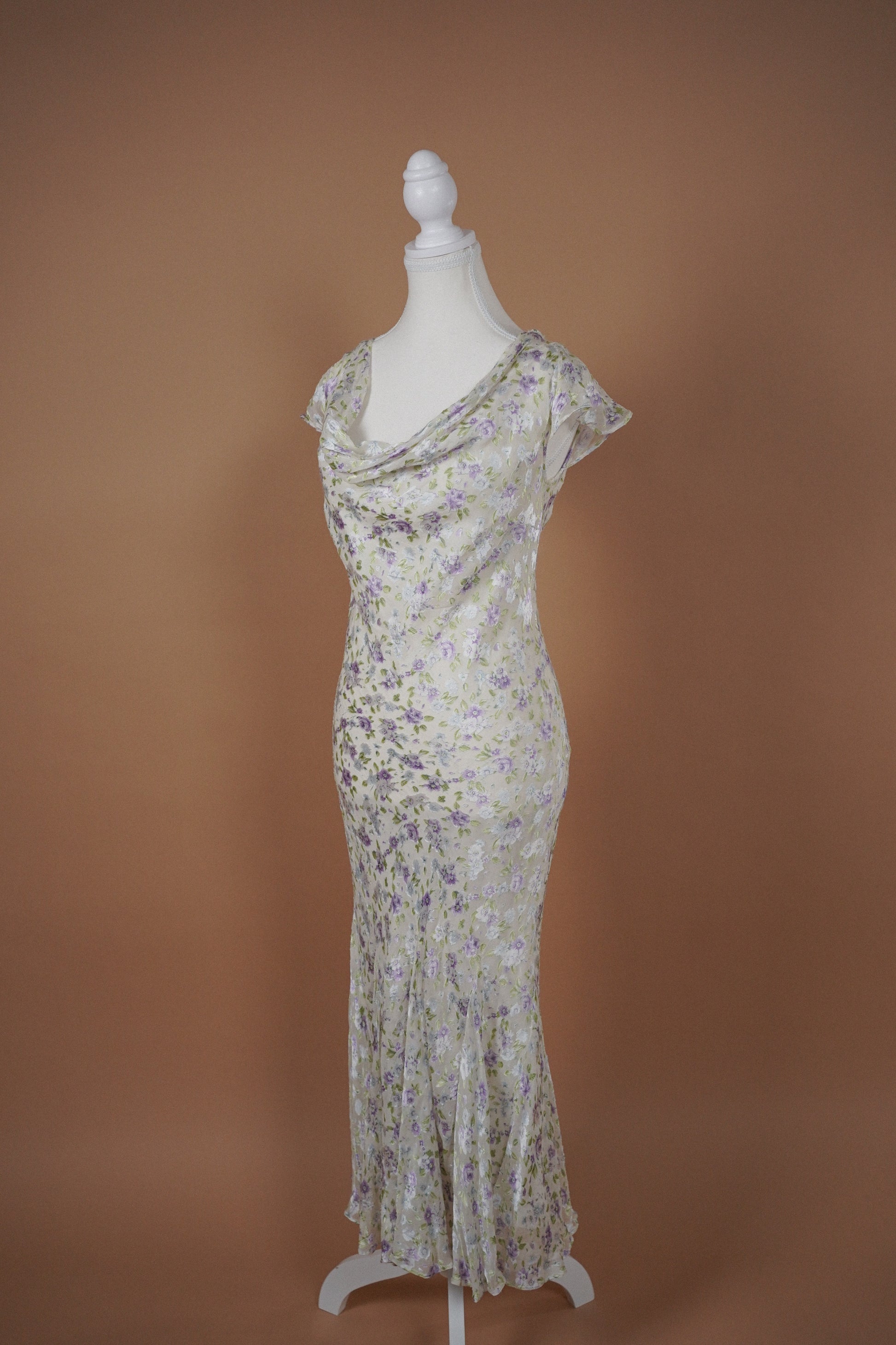 Soft romantic vintage chiffon dress in a delicate white, lilac, blue and sage floral print. Features a draped cowl neckline, short flutter sleeves, and a gently flared hem that moves beautifully when worn. Lightweight and flowing with a bias cut style silhouette through the body.