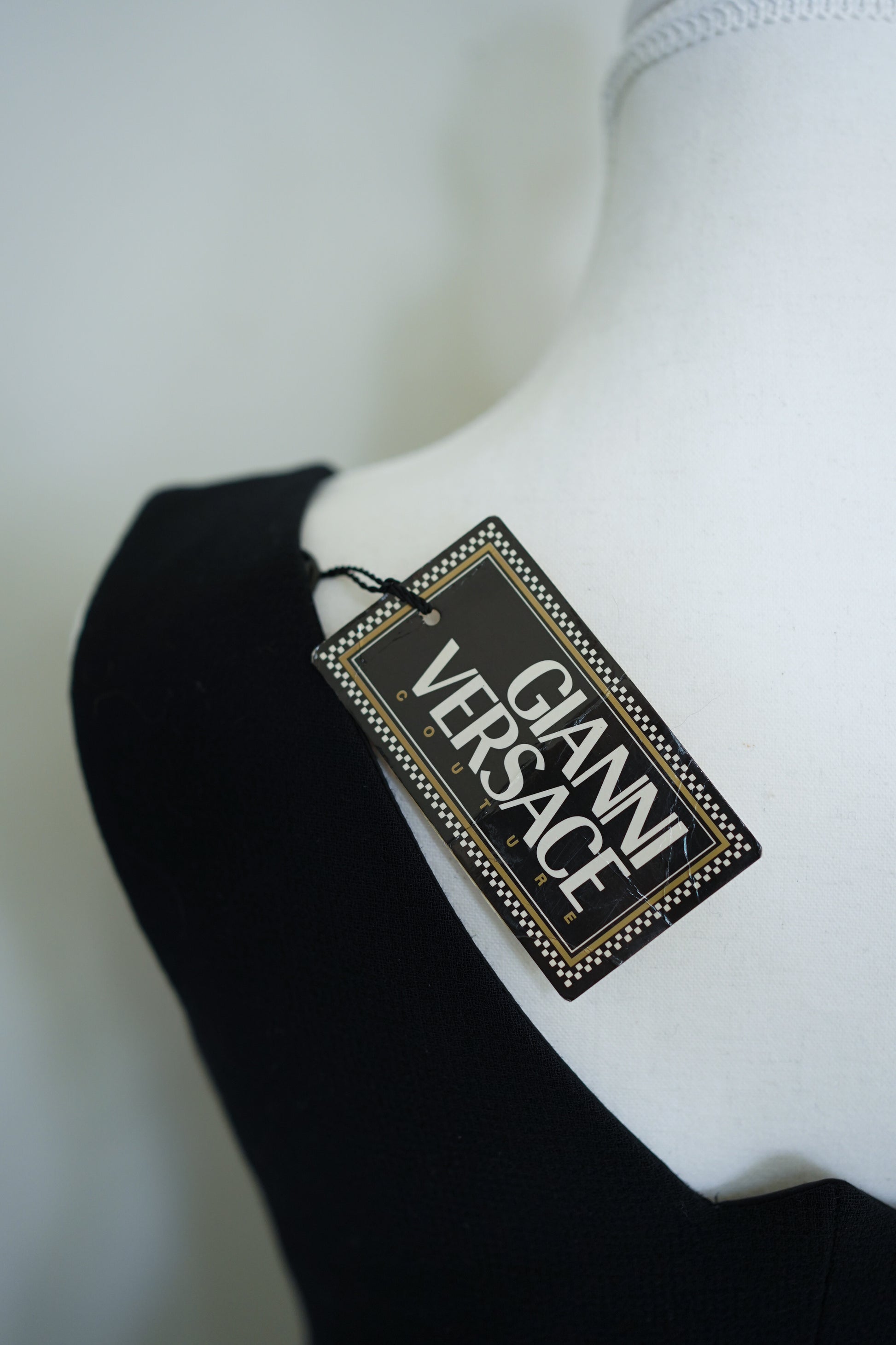A rare deadstock Gianni Versace Couture black wool crepe sheath dress from the late 1990s, complete with its original boutique tags still attached. This impeccably structured piece is cut in a minimalist, body-skimming silhouette with a clean front, a subtle centre-back vent, and a sculpted V-notch back neckline—a refined architectural detail often seen in Gianni’s quieter couture designs.