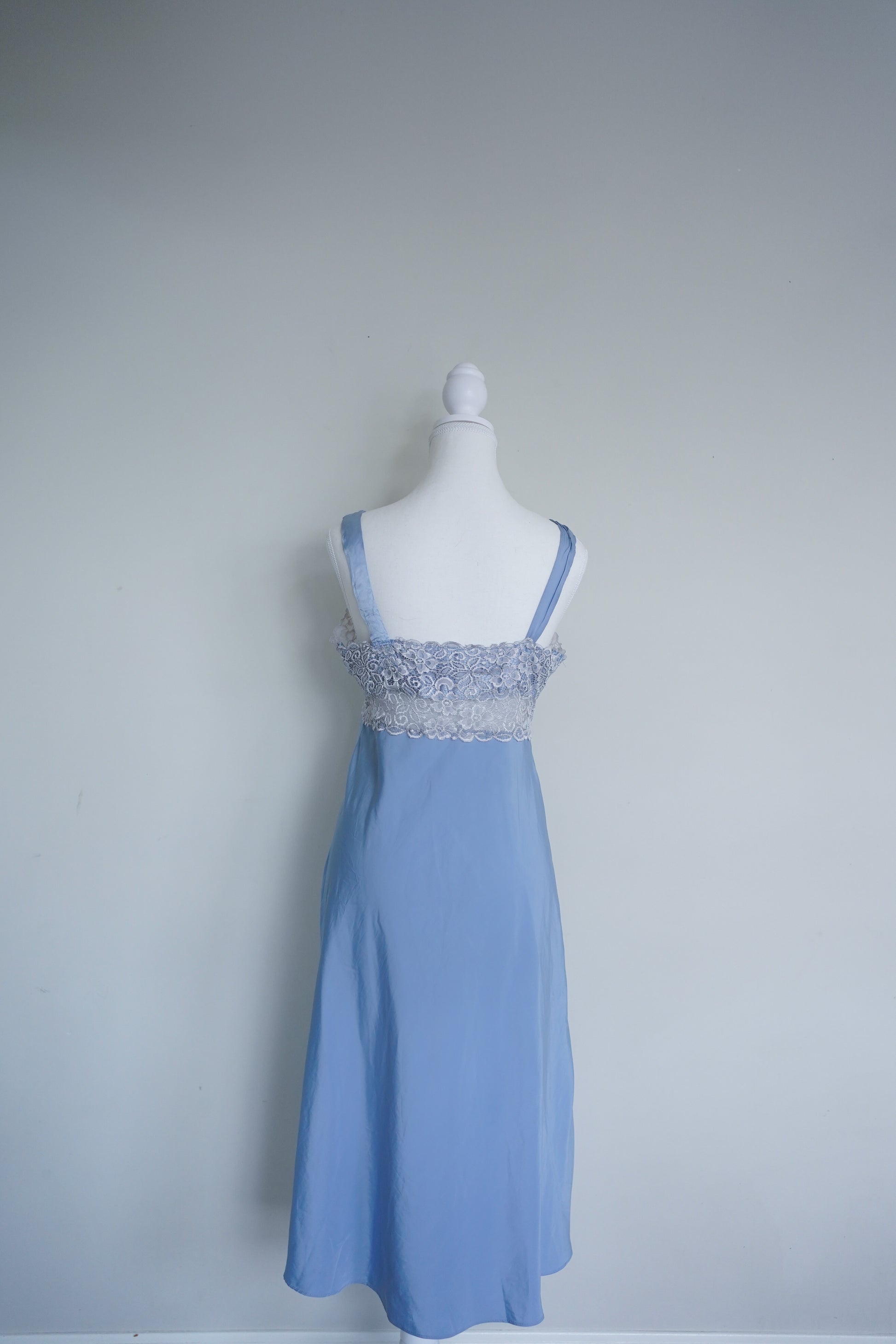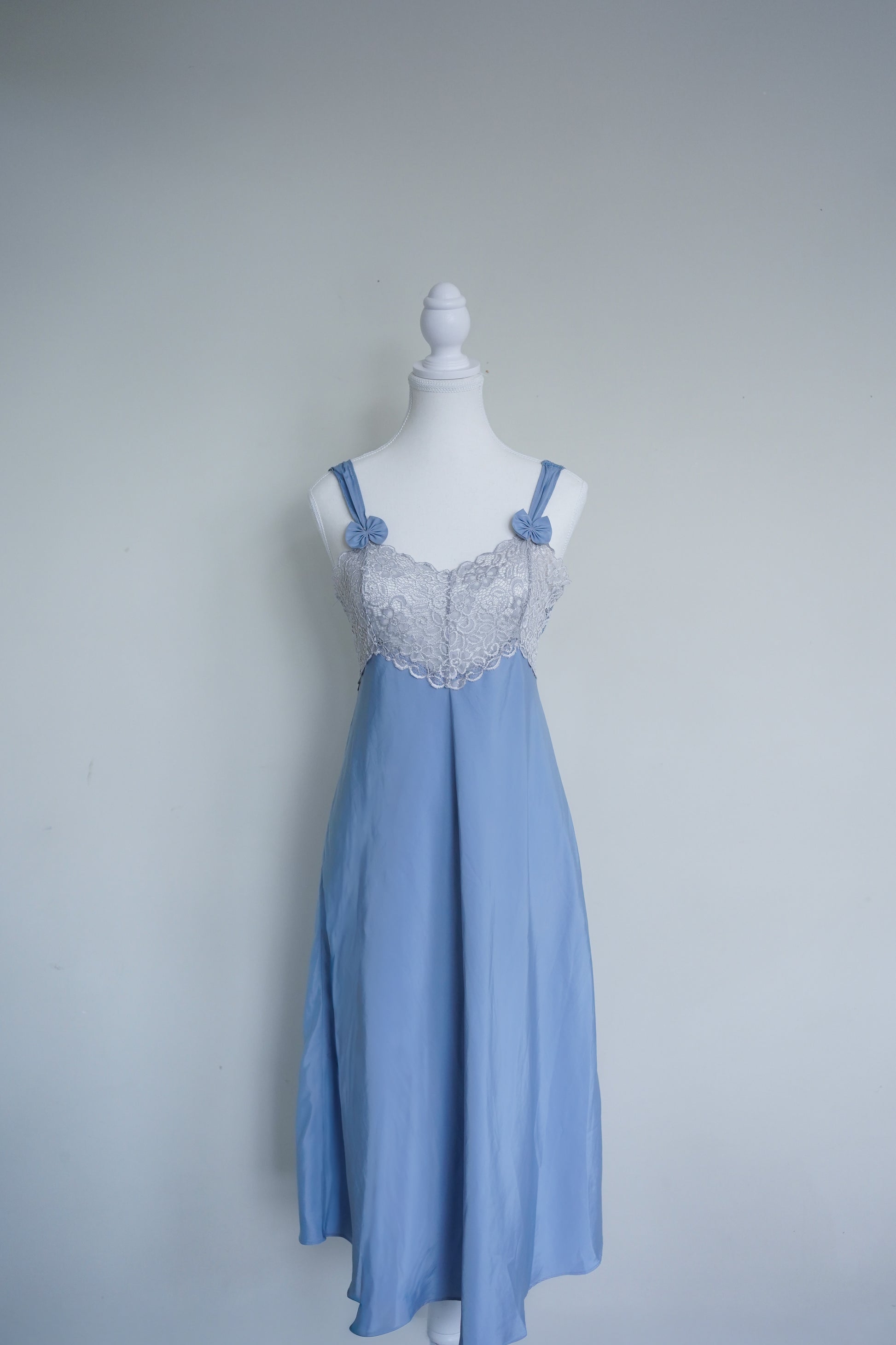 A soft, powder-blue vintage nightgown featuring a scalloped lace bodice and straps finished with matching bow appliqués. One strap has been resewn at the midpoint.
