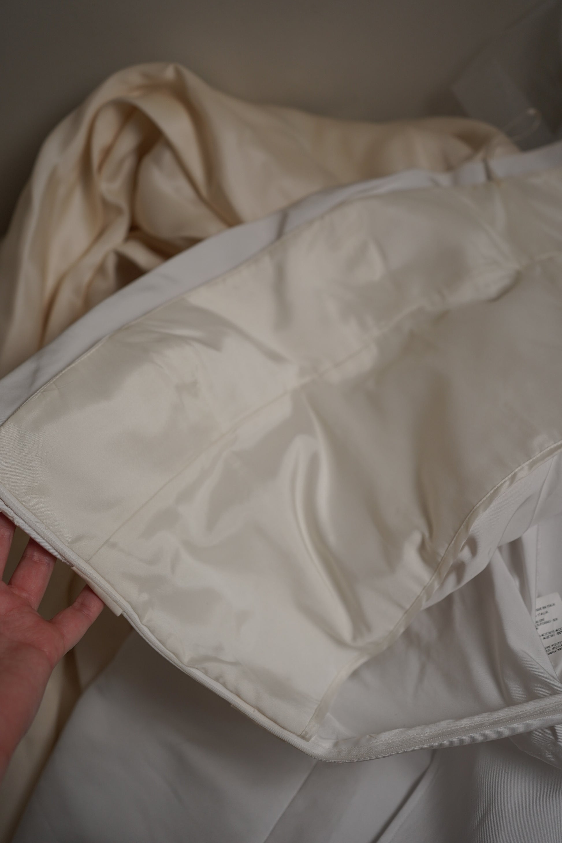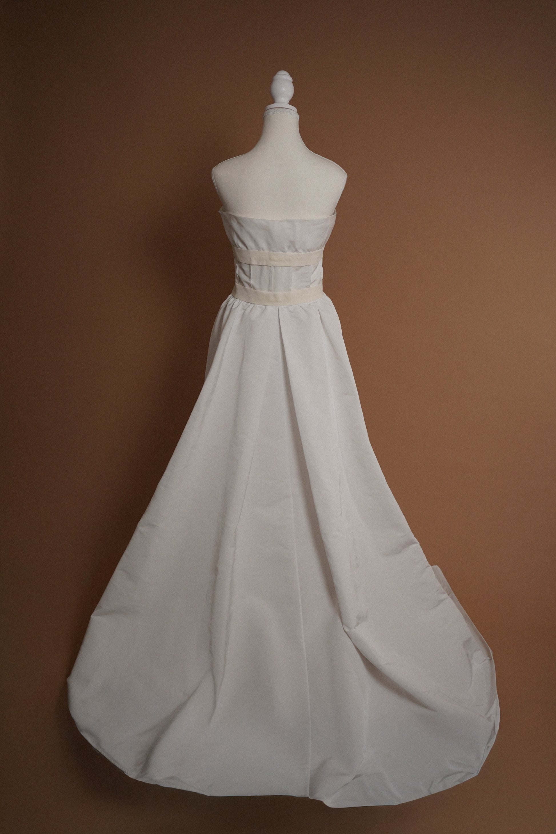Strapless Valentino Roma gown crafted in crisp ivory with an elegant, understated silhouette. The bodice features soft internal structure for support, a smooth bandeau neckline, and a clean waist seam that flows into a gently Colin skirt with dramatic train overlay. A very 1950’s/60’s inspired silhouettes Finished with an optional ivory tie at the waist, allowing for versatile styling—wear with or without the bow for a more minimal look. A timeless, architectural bridal look or perfect for a polished civil ceremony gown.