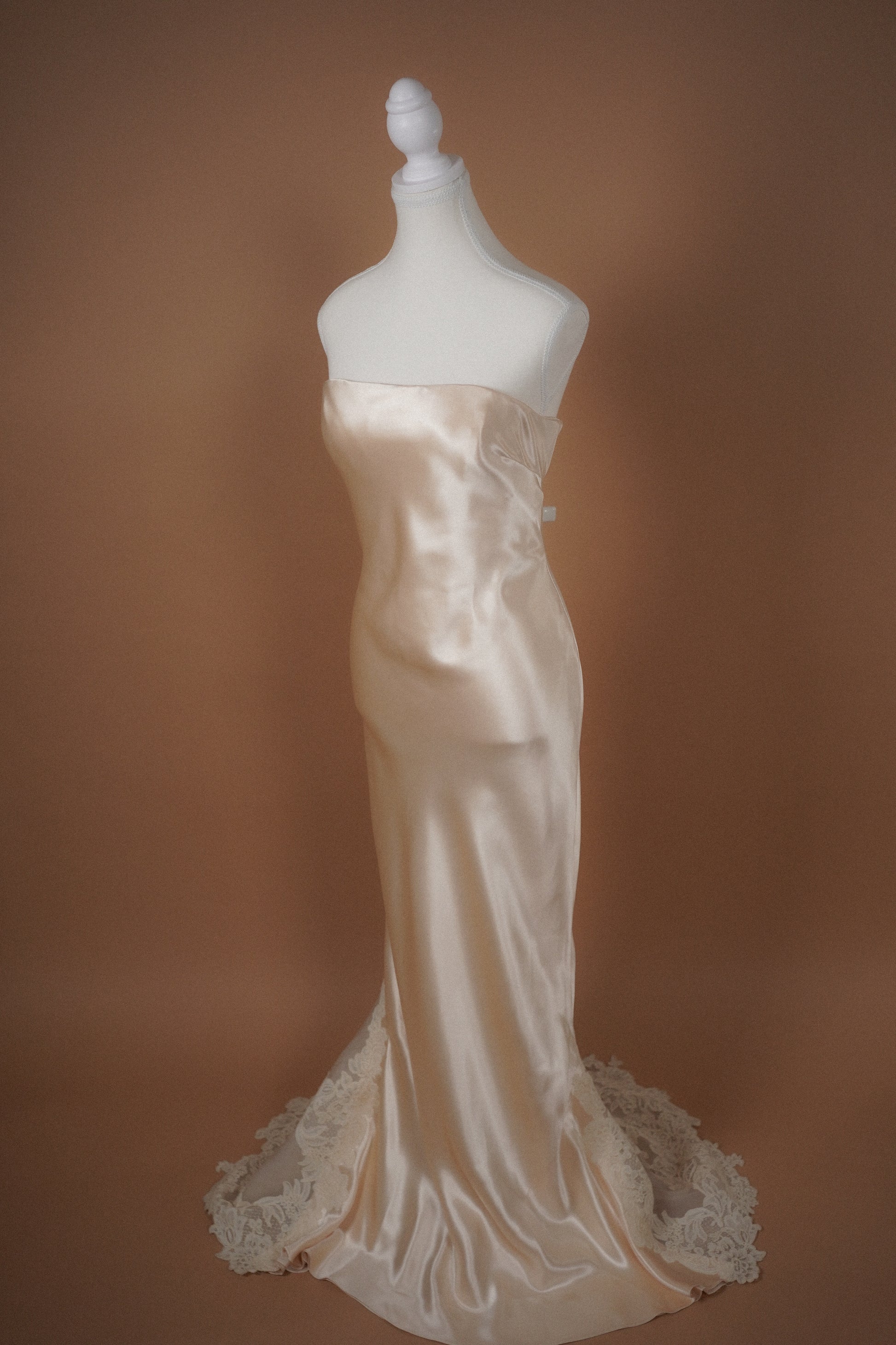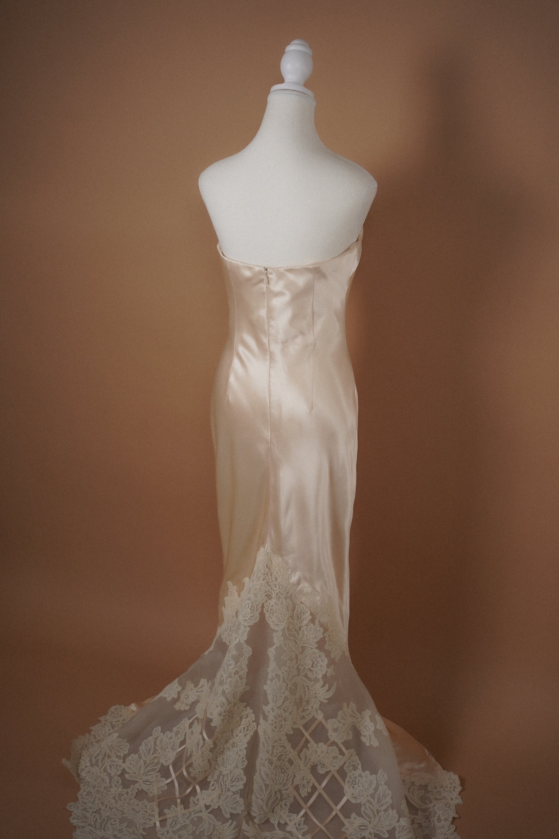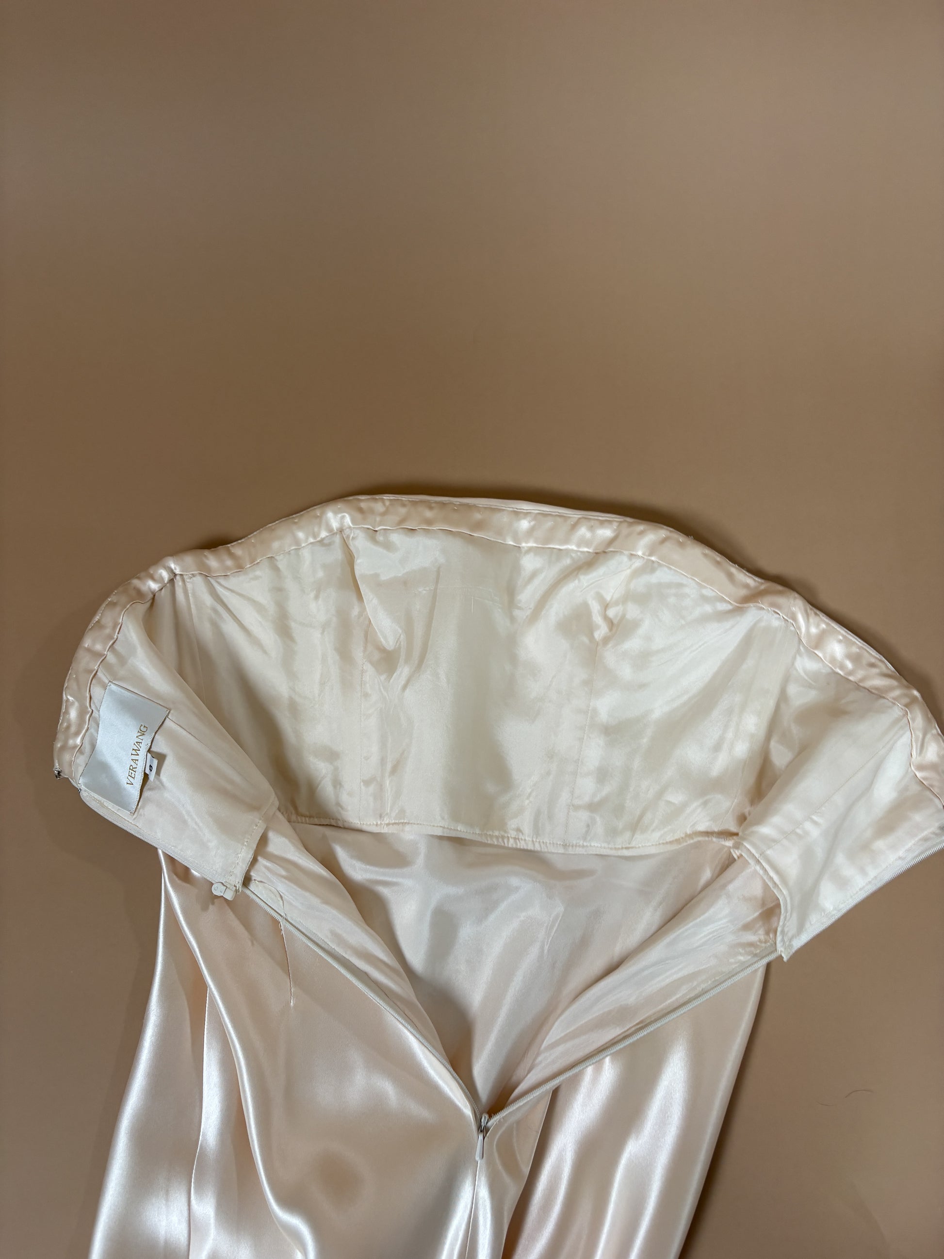 Minimal strapless vintage Vera Wang bridal gown in a soft blush champagne toned satin. Clean column silhouette with subtle structure through the bodice and a delicate lace inset train at the back. Elegant, understated, and timeless with beautiful movement and sheen.