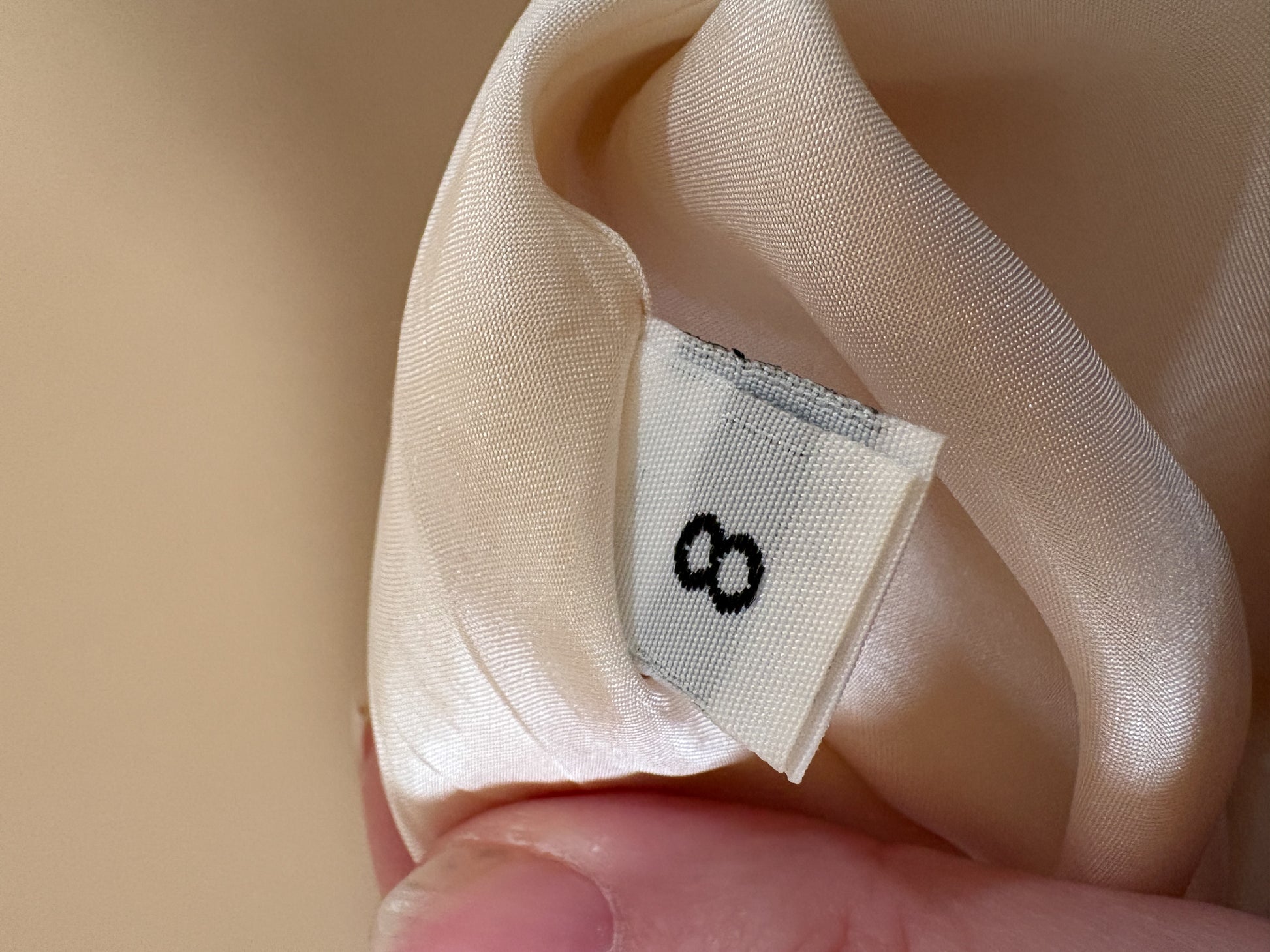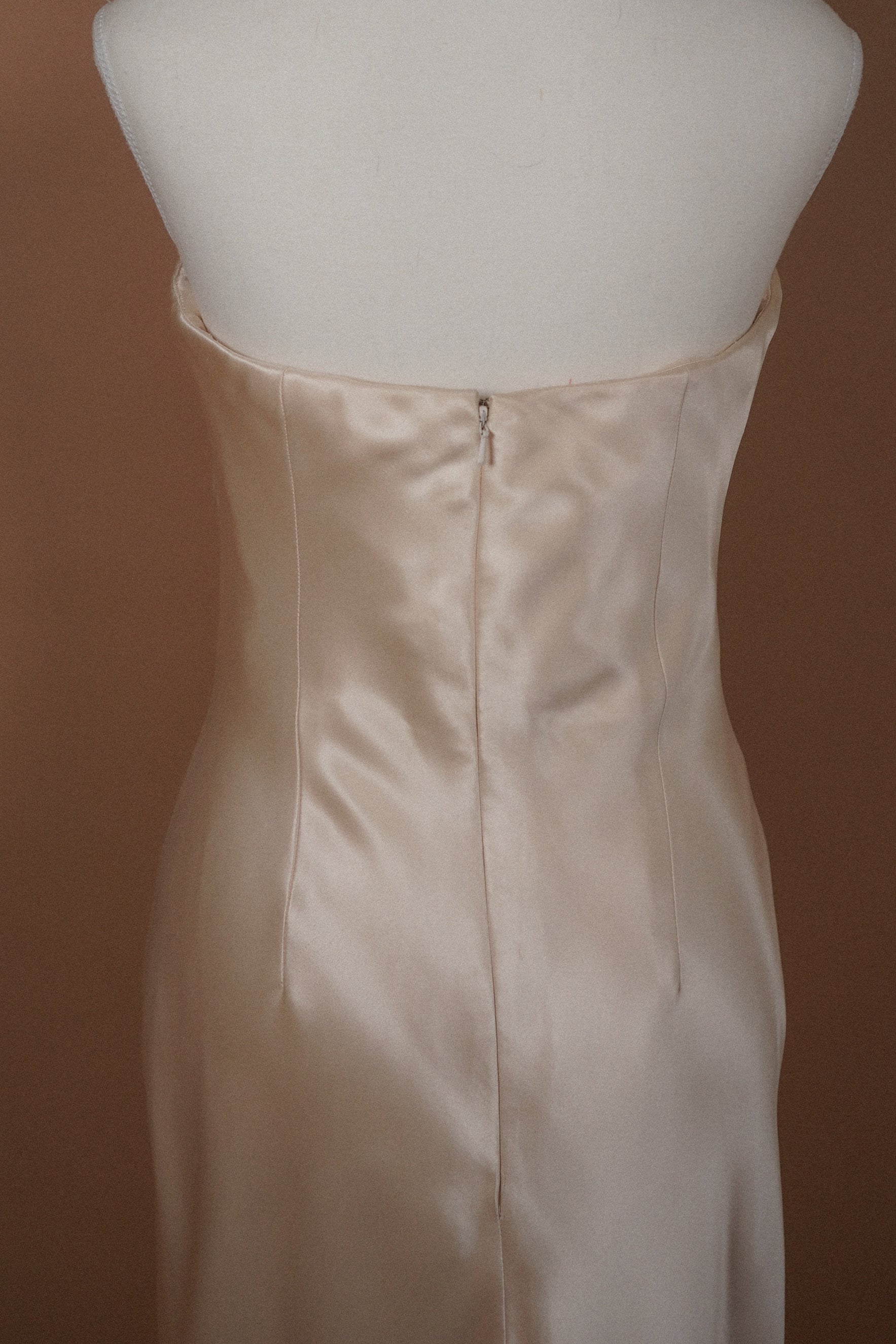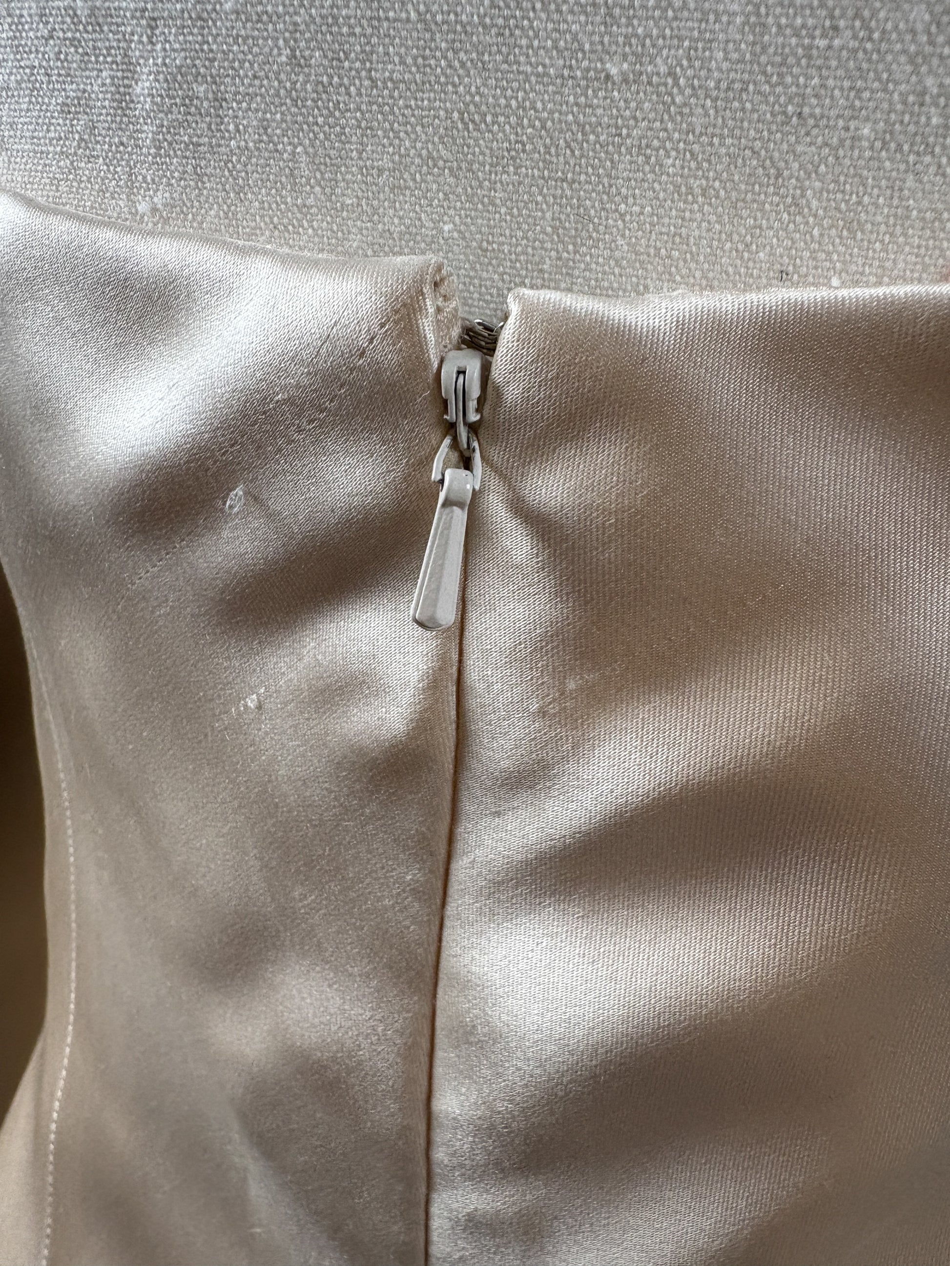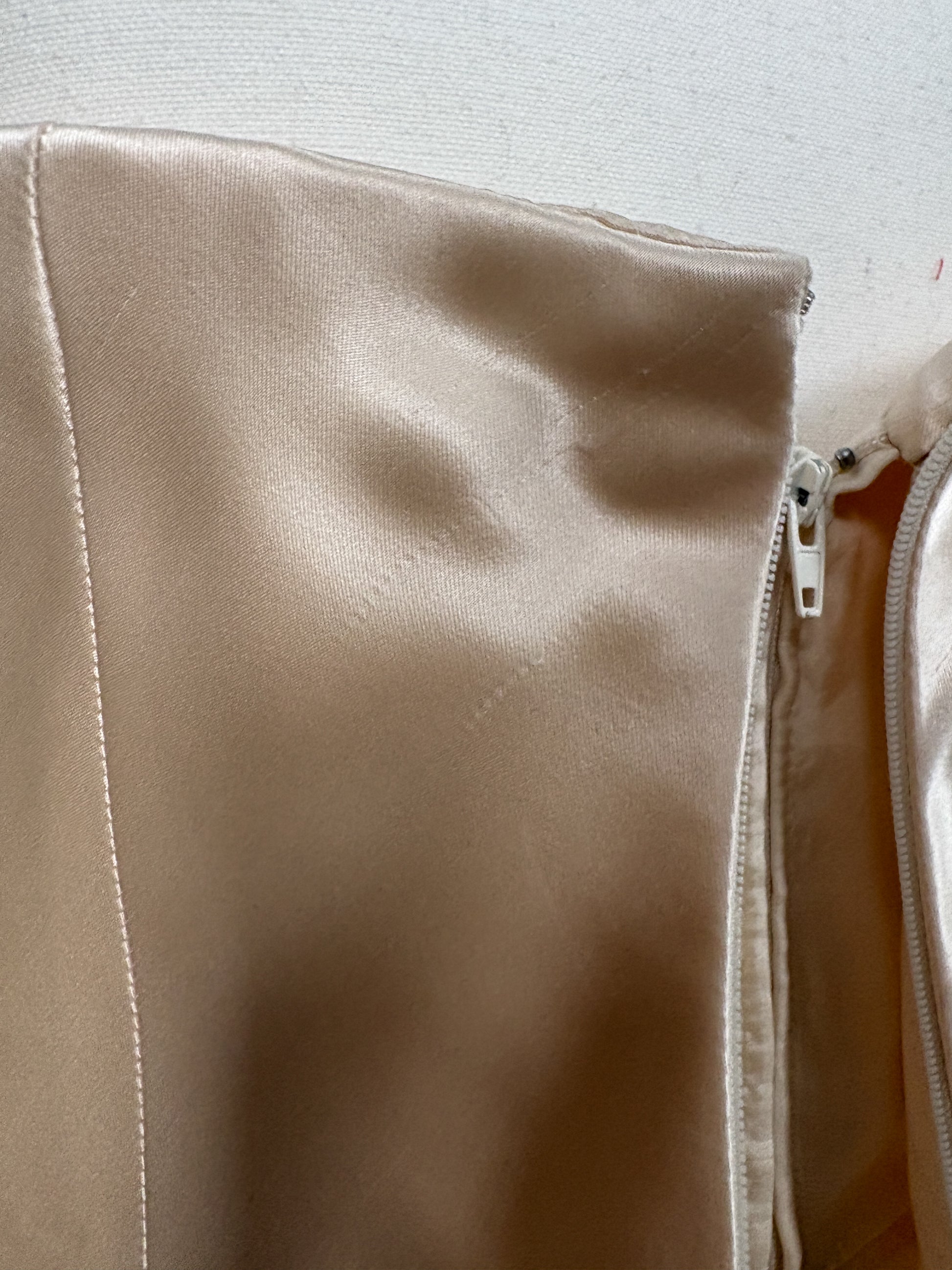 Minimal strapless vintage Vera Wang bridal gown in a soft blush champagne toned satin. Clean column silhouette with subtle structure through the bodice and a delicate lace inset train at the back. Elegant, understated, and timeless with beautiful movement and sheen.