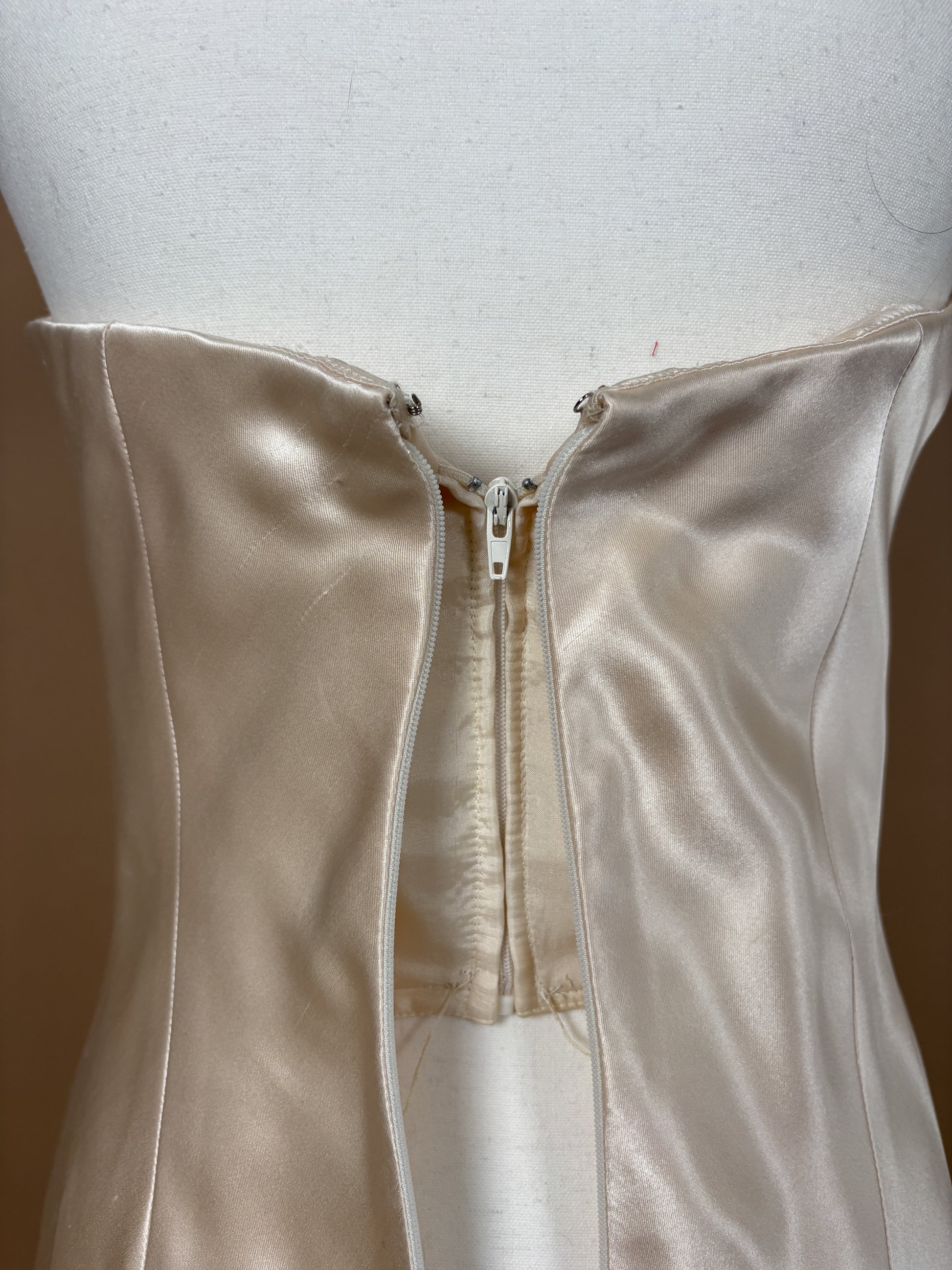 CONDITION: 9/10 - two small dots on bodice shown in photos. And some age related wear to the satin and train all visible in photos.