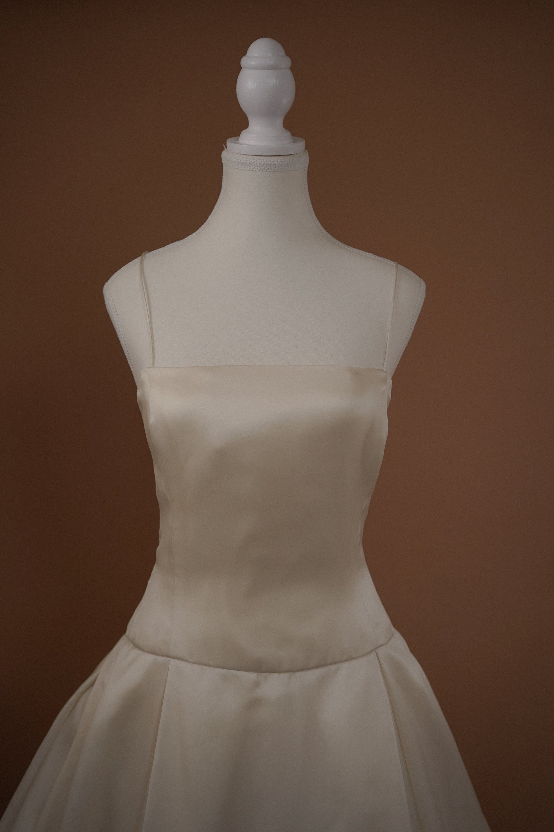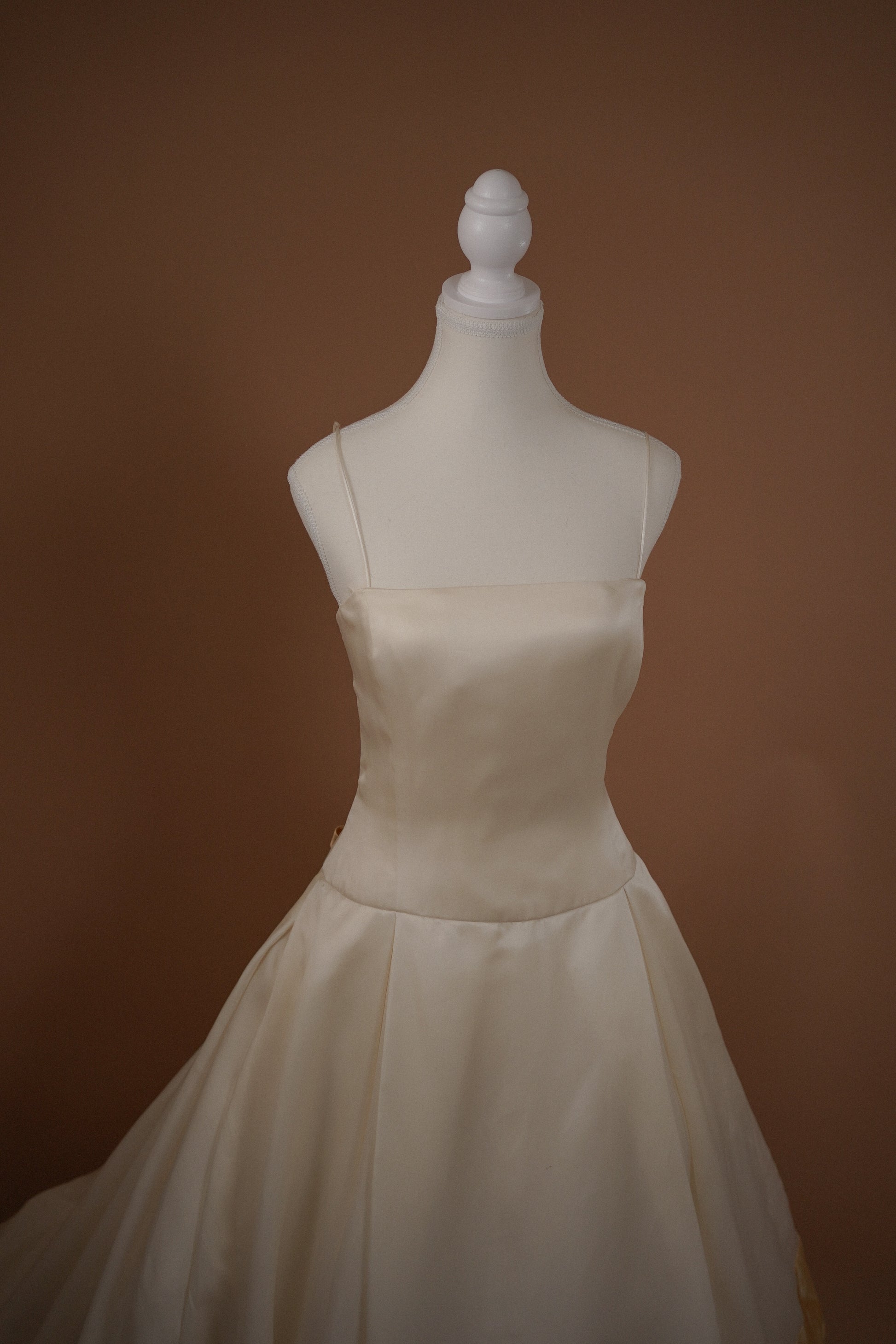 The gown has a timeless silhouette with slim spaghetti straps, a clean straight neckline, and a fitted bustier bodice that flows into a voluminous skirt with beautiful movement. The bodice snatches the waistline and creates stunning lines. Finished with three satin bows at the back for an unmistakably vintage Vera Wang touch. A stunning option for brides seeking something traditional yet softly unconventional, or for another bridal event look gown with character and depth.