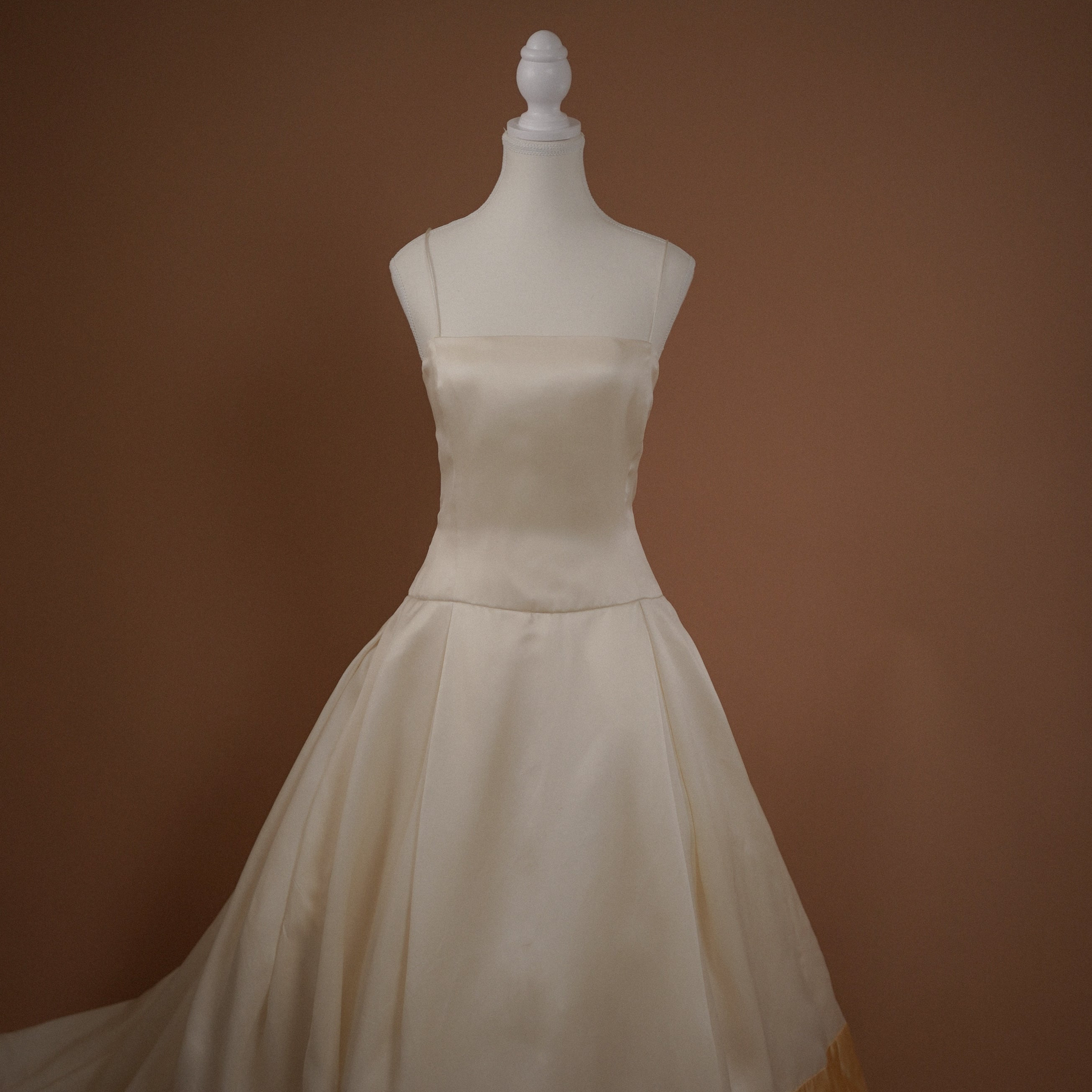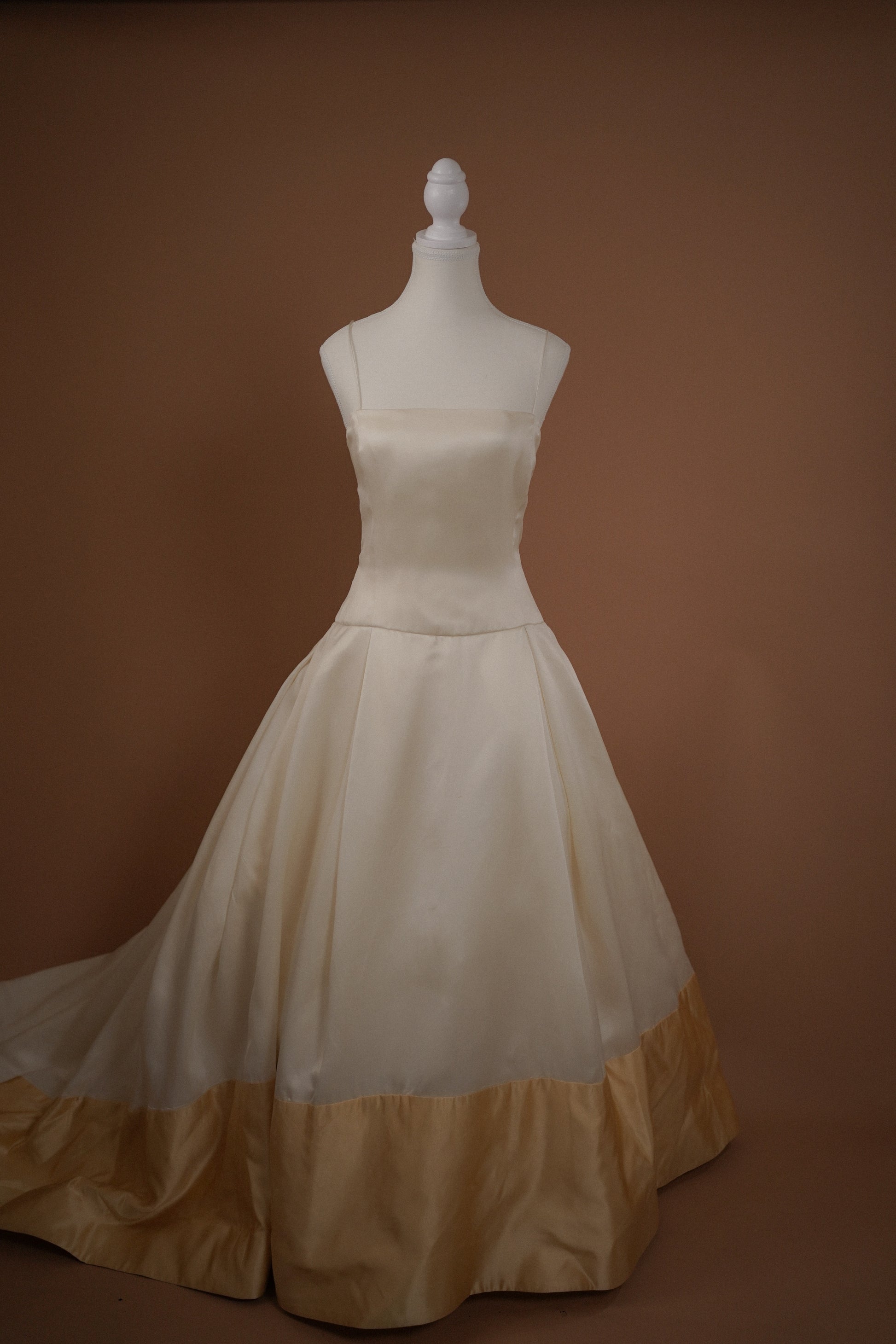 A romantic vintage Vera Wang bridal gown featuring a structured silk bodice and full skirt with warm candlelight silk tone and champagne-gold trim. This design balances classic Vera golden age bridal elegance with a twist with the golden satin underlayer and delicate bow detailing at the back waist.